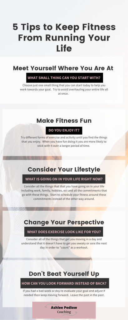 So what does your fitness journey look like then? Well…it looks like what works for you. Honestly…it’s as simple as that. A lot of people have a hard time wrapping their heads around this so keep reading for 5 ways to bring health and fitness into your life without letting it run your life.