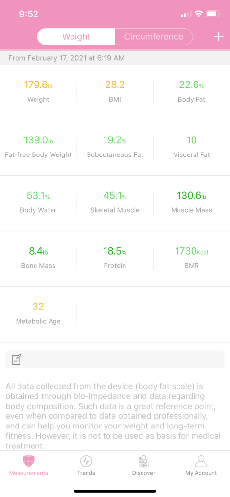 To illustrate exactly what I mean here and why it’s important to consider more than just the body weight I will use an example from my personal scale. The green colour indicates what’s considered average, the dark green colour is above average and the yellow numbers are considered a needs improvement area. Looking at the image you can see that for me personally my body weight which can fluctuate about 2-3 pounds a day when taken first thing in the morning and my BMI are considered are area for improvement. However, looking at the remaining areas like body fat percentages, muscle mass and bone mass values they are all falling in a green or dark green colour. Have I convinced you now? Consider the fact that just a regular scale that is just giving you your body weight may result in concern with body weight as would be illustrated here with my personal numbers. But when I look at my percent body fat and muscle mass measures I’m not concerned. As a side note; this is why BMI can also be an inaccurate indication of health in SOME CASES. I want to be clear that this is not always true, but if you are falling into a “overweight” BMI category it may be worth exploring your body composition before writing it off completely.