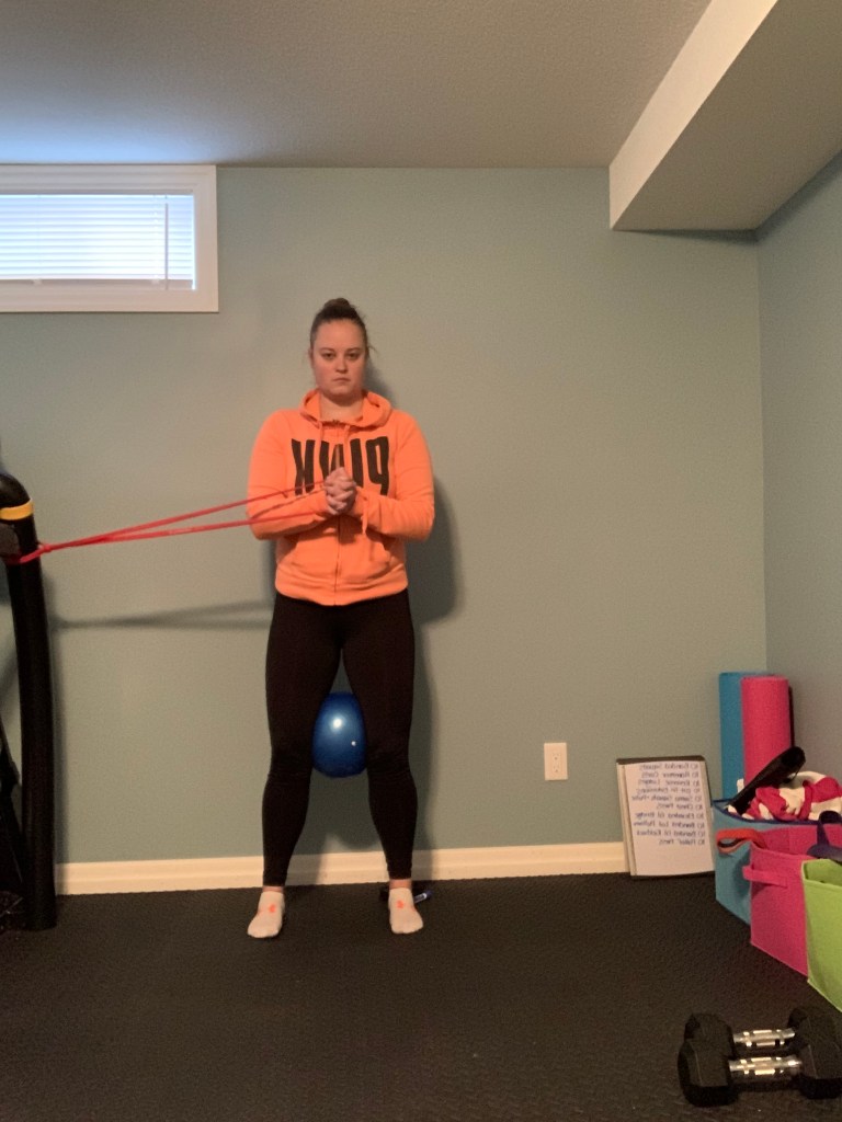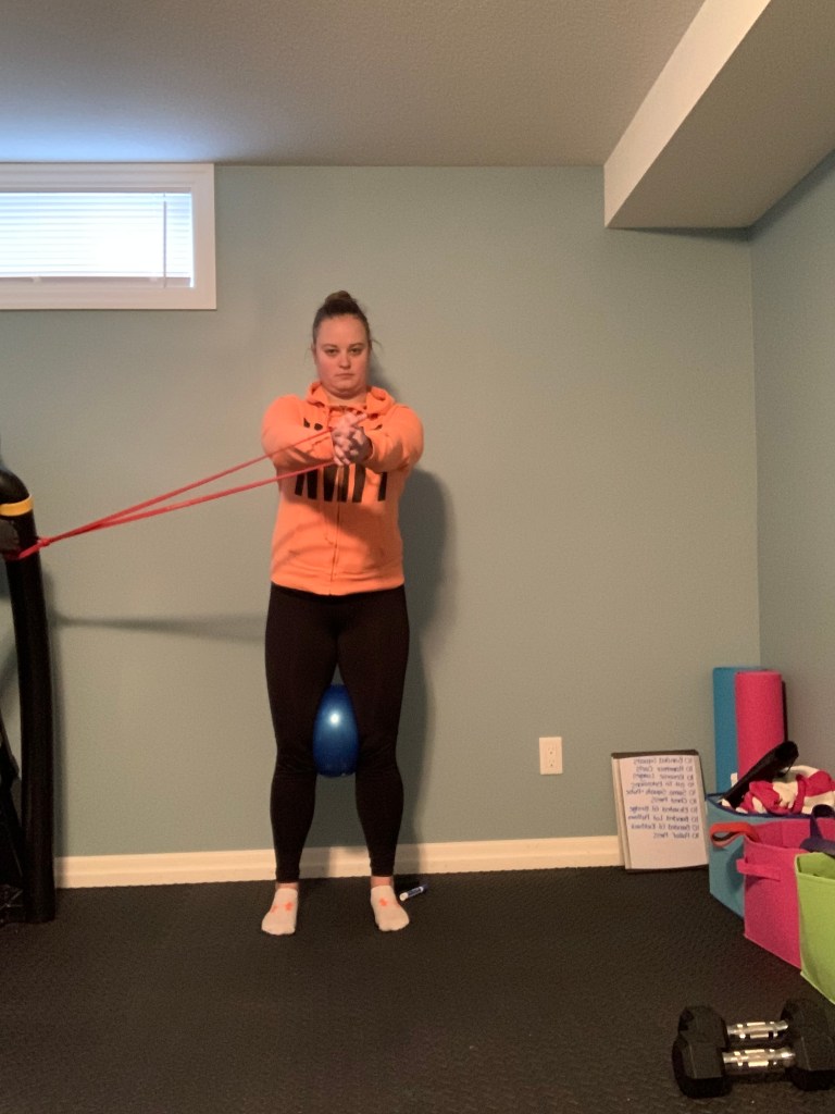Begin by anchoring a band to something sturdy at about chest height and placing a small Pilates or kids ball between your thighs. As you press the band straight out from your chest exhale and squeeze the ball with your inner thighs. As you bring your hands back towards your chest inhale and release the ball between your thighs (without letting it drop).