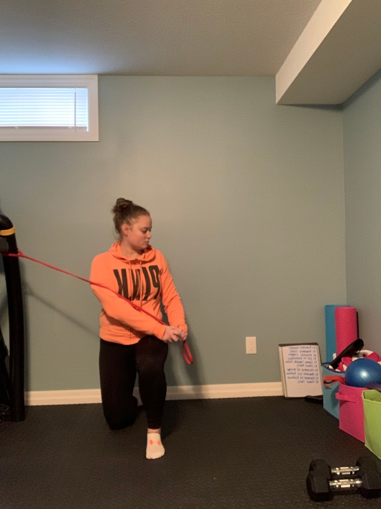 Begin by anchoring a band at a higher height (top of a door frame will work well). Take a half kneeling position (one knee on the floor, the other knee bent) and hold the band in over top of your shoulder. Engage your core and pelvic floor and pull the band across your chest towards the opposite hip rotating as you do. Then return to the starting position.