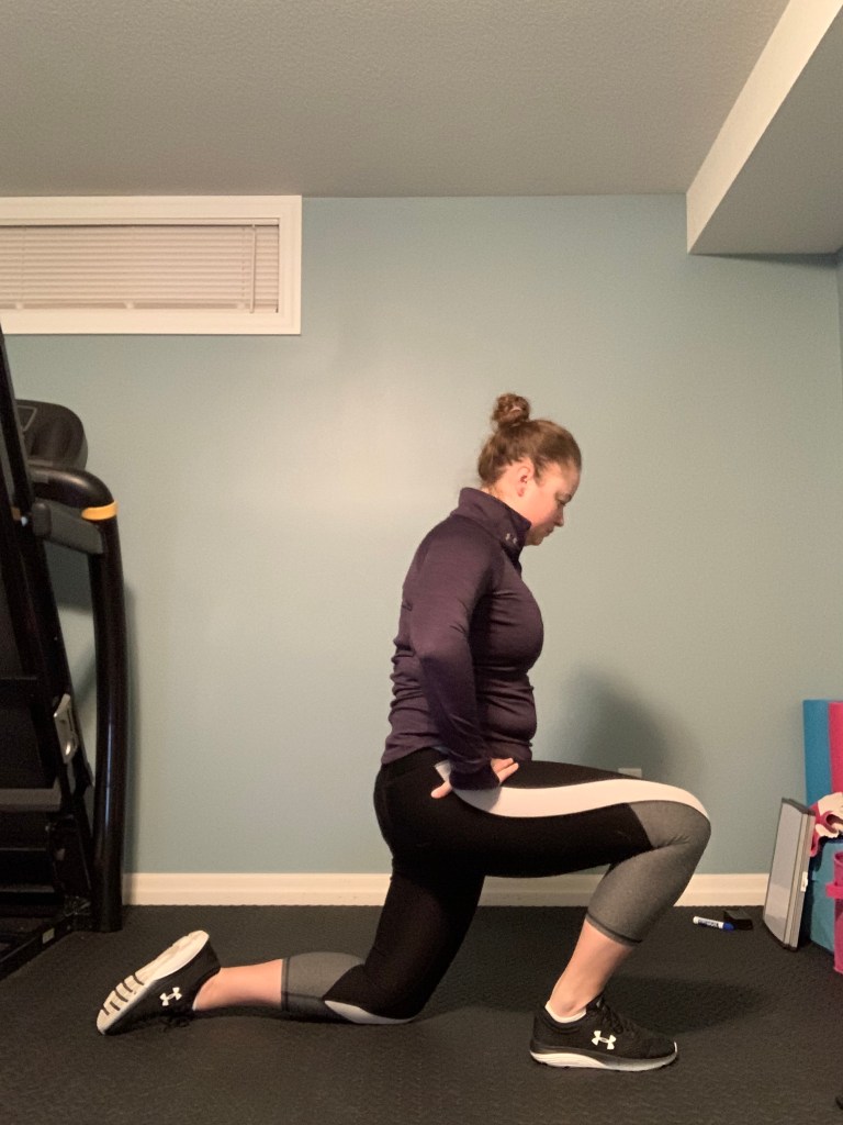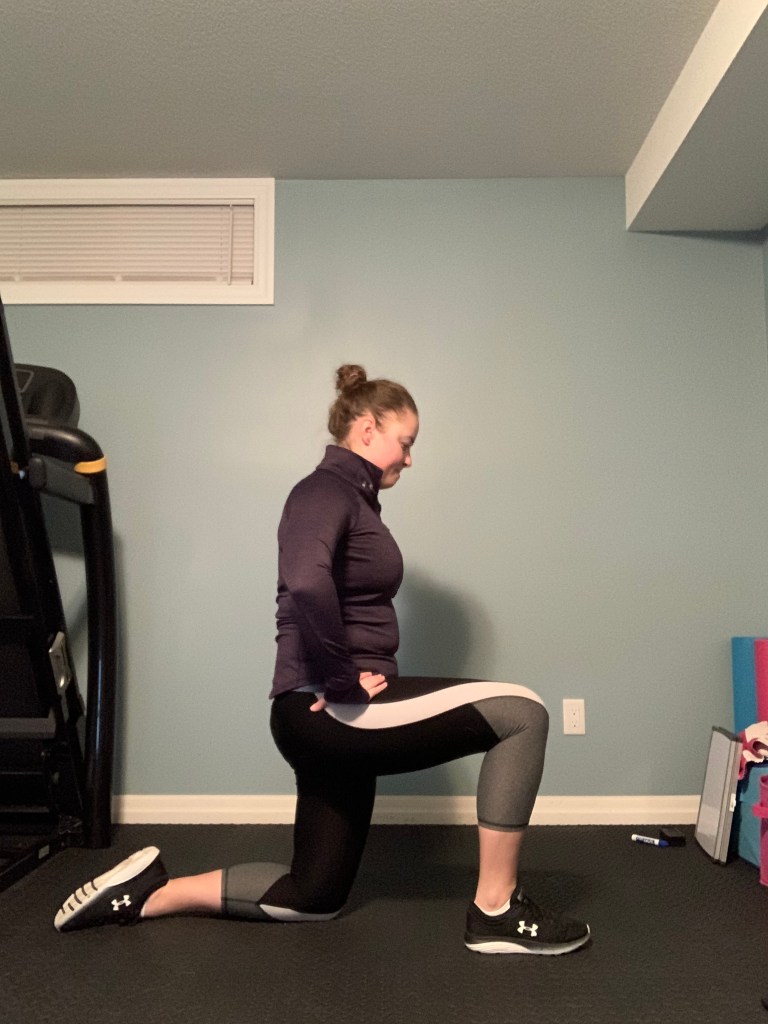 Begin in a lunge position with the front knee bent and the back knee on the floor. Emphasize and focus on tucking the butt under and keeping your knee straight ahead before leaning forward into the lunge.