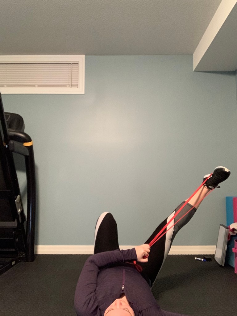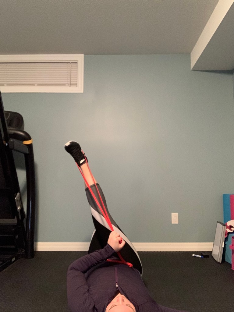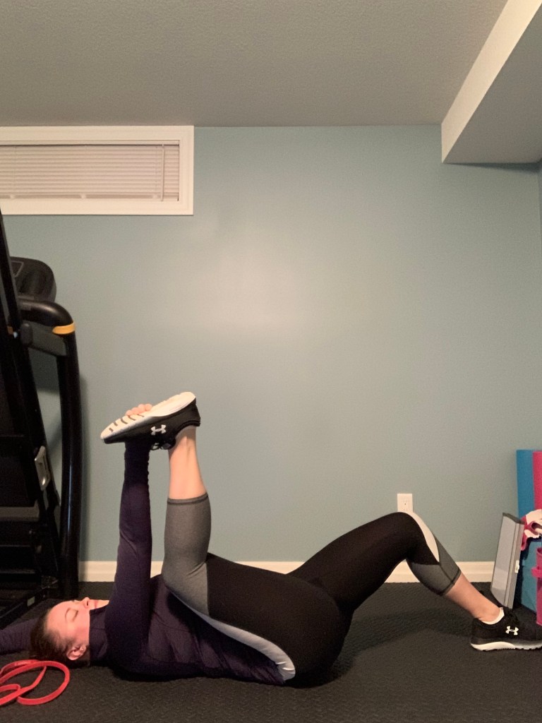 Grab a band or a towel to get started (you will use this for this exercise as well as the next two as well). Lie down on your back and wrap the band/towel around your foot. Foot on the floor can be straight out or bent, chose what’s comfortable for you. Lift one leg straight in the air (straight or slightly bent) and use the band to stretch through the hamstring by pushing through the heel