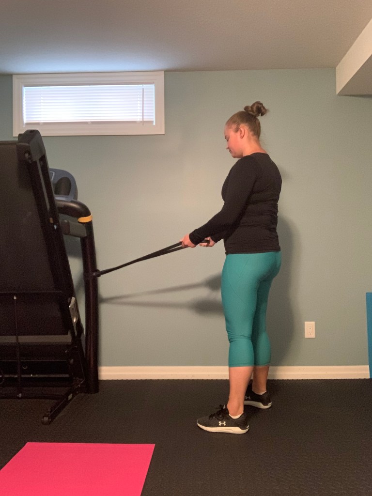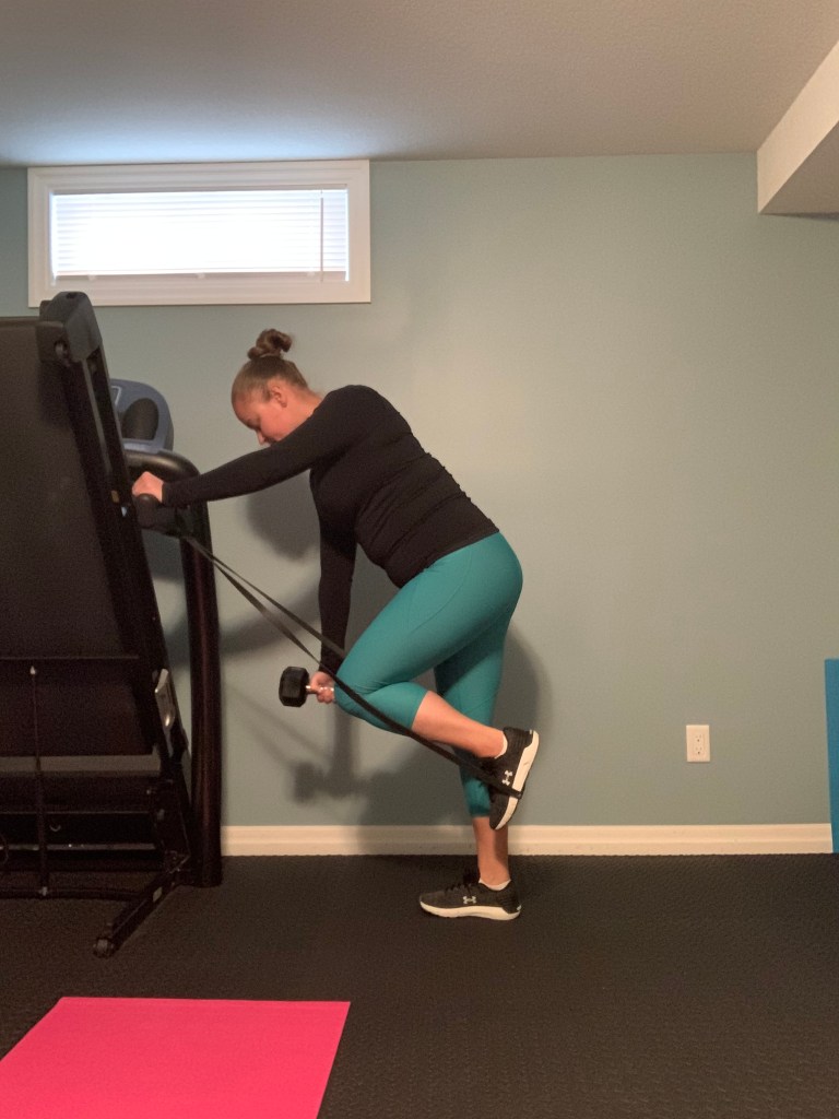 Anchor your band at about chest height and place your foot through the band. Ensure you have a slight bend in your knee of the standing leg. Grab a dumbbell in the opposite hand (as the foot that will be kicking back). Once in starting position kick your foot out behind you keeping your core tight and a neutral spine. As you kick your foot out row the dumbbell up and squeeze your shoulder blades together as you do so. Return to your starting position. Ensure that you complete on both sides.