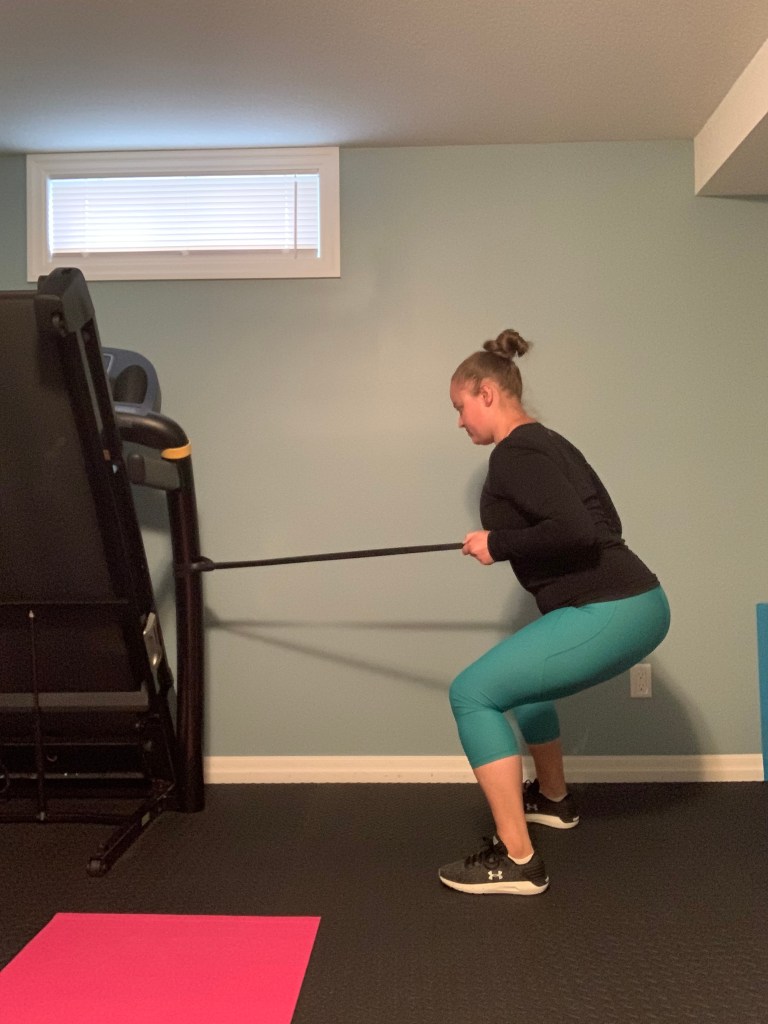 Begin by anchoring a band to something sturdy at about the height of your hips (or a bit higher). Position yourself to complete a squat and drop your butt backwards like you are reaching your bum out towards an imaginary chair behind you. At the bottom of the squat row against the band by pulling your elbows straight back and squeezing your shoulder blades together. Bring your arms back forward and return to a standing position