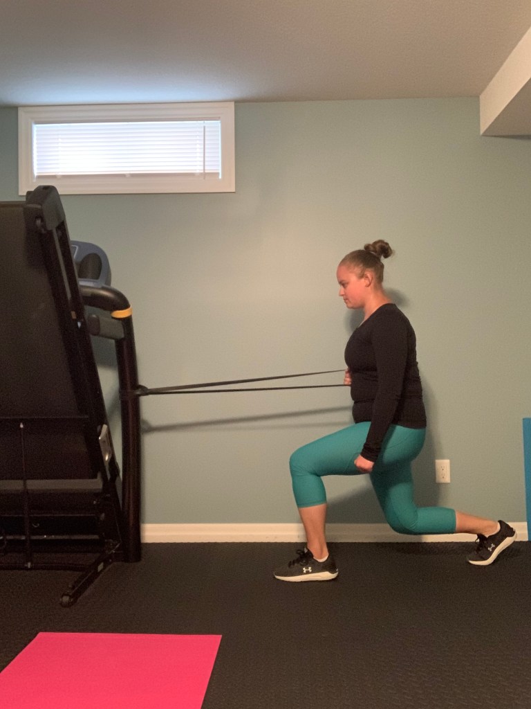 Begin by anchoring a band to something sturdy at about the height of your hips (or a bit higher). Ensure that the band is on the side that will be stepping backwards (opposite to the stationary leg). As you step back into a lunge drop your back knee towards the floor and row your elbow backwards squeezing your shoulder blades together. Return to the start position. Ensure you repeat on both sides.