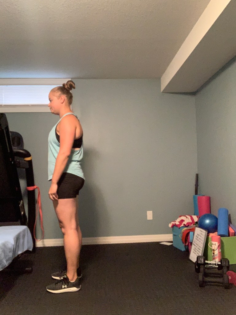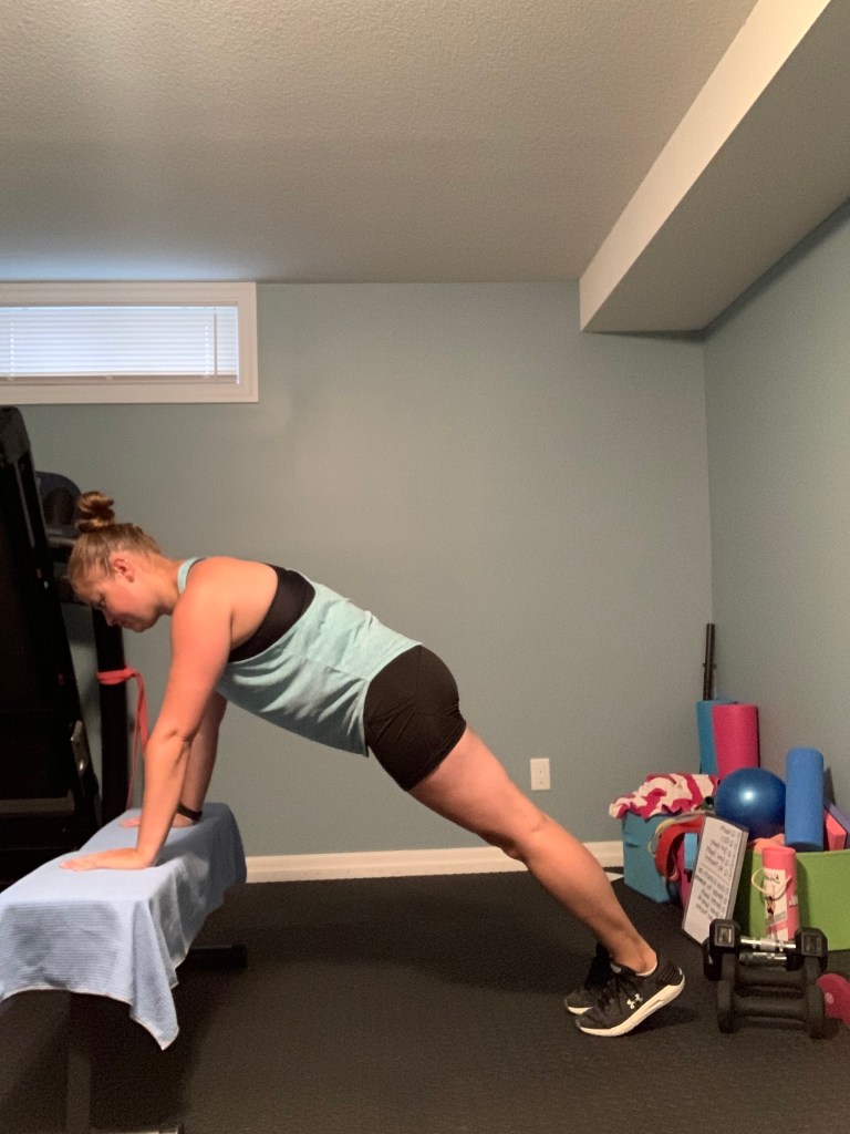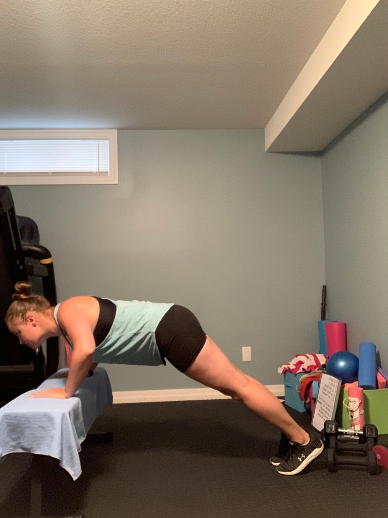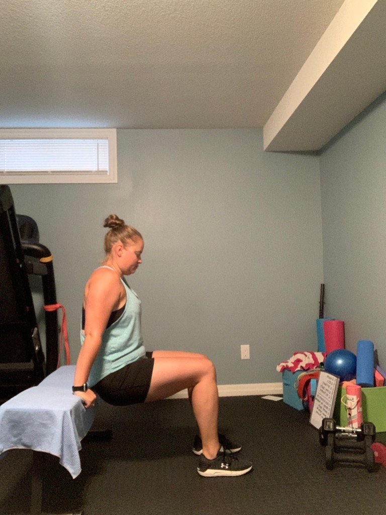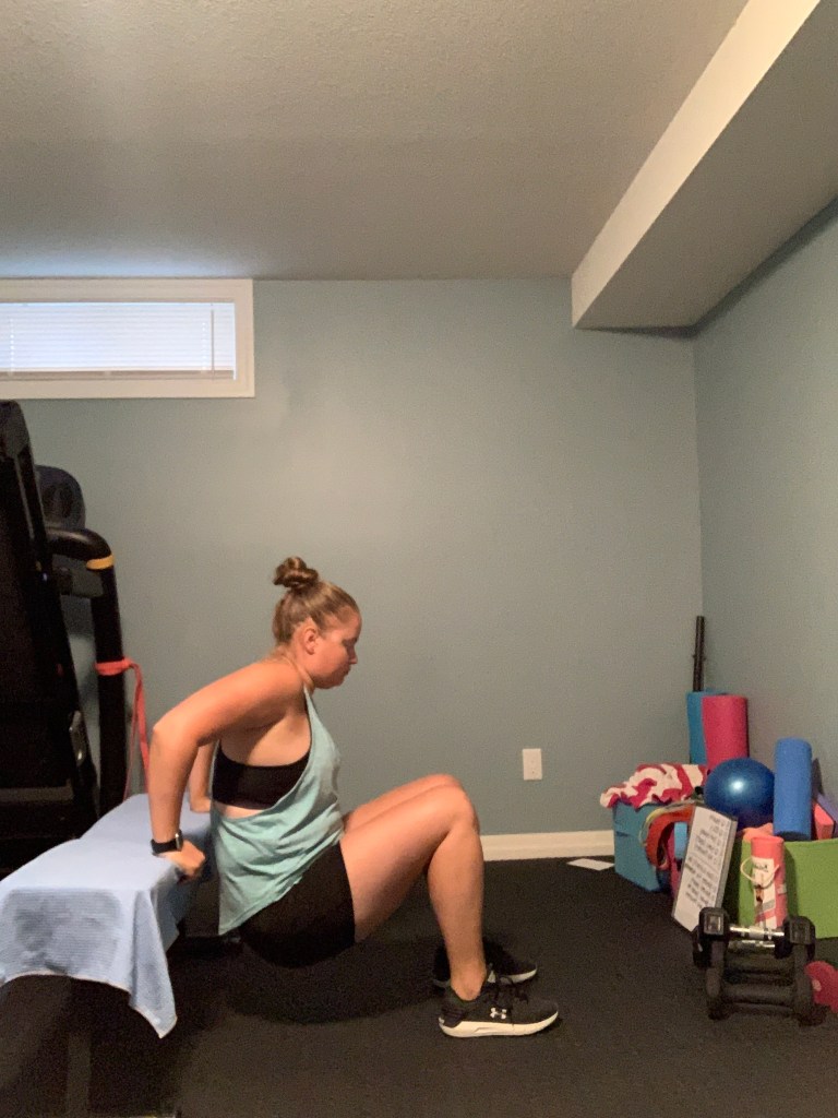 Below you will find a bodyweight workout you can do from home without any equipment at all (maybe the edge of the couch or a chair for the tricep dips, but that’s all you need). Working out at home doesn’t have to be complicated and it doesn’t have to require all kinds of fancy equipment. Give this workout a try today and mix up your routine with some body weight training this week. Complete 8-12 reps of each exercise beginning with the first exercise and moving through each exercise in a circuit format. Repeat the circuit 2-4 times as your time allows. This is a full body circuit so it can be repeated every other day as your energy and time allows. If you are pregnant or immediately postpartum please note that you may want to make adjustments as needed. I have included possible adjustments in the descriptions of each exercise as well.