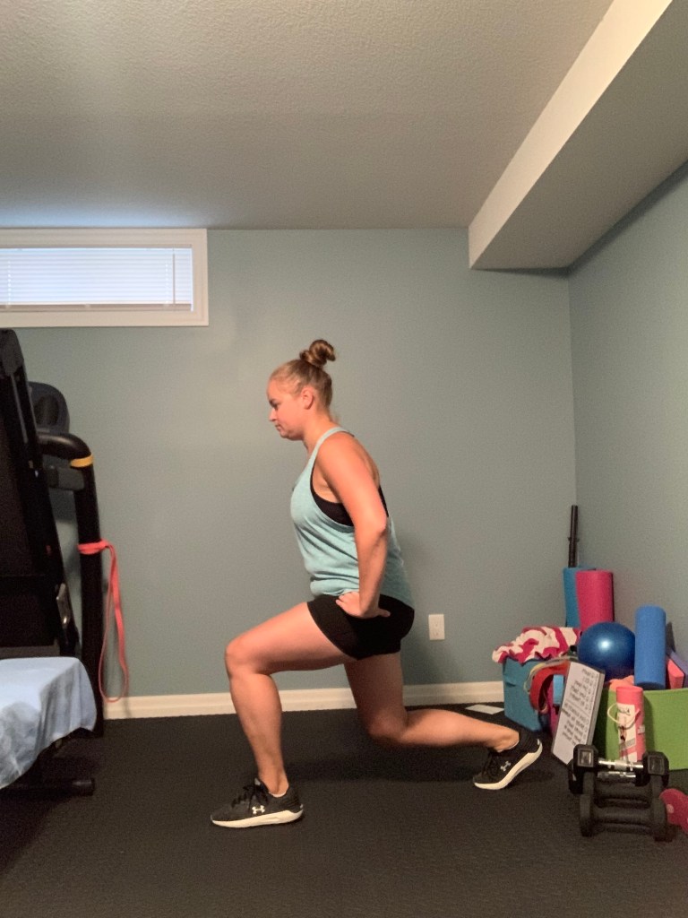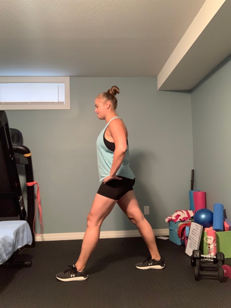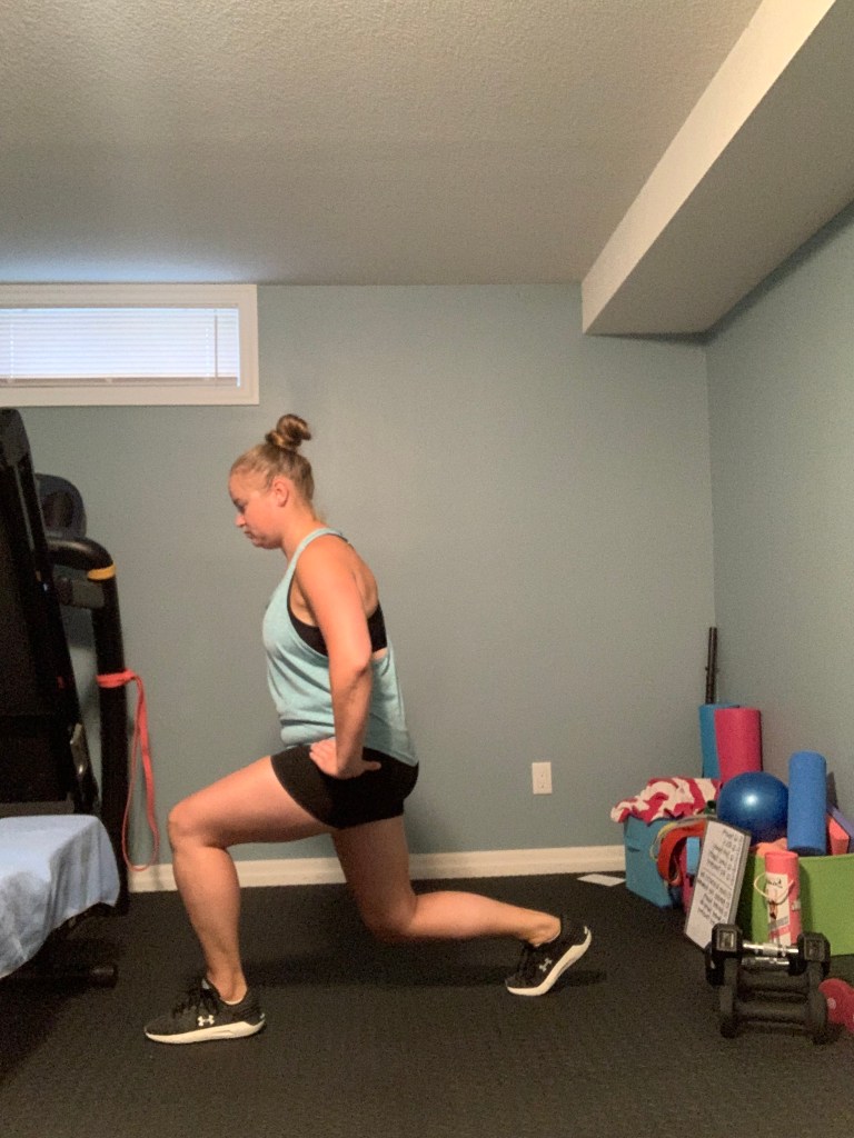 Reverse Lunge: Begin with your feet hip to shoulder width apart. Engage your core and step backwards while bending both your front and back knees. Focus on keeping your front knee over top of the foot and your back knee dropping straight to the floor while keeping your core engaged and your torso upright. Step your back foot back forwards to come back together with your front foot and return to your starting position standing tall. Alternate legs. If you require additional balance you can swap in the Split Squat variation or use a wall for additional balance. If you are later in your pregnancy you may need to widen your lunge stance slightly to accommodate for the growing belly.
