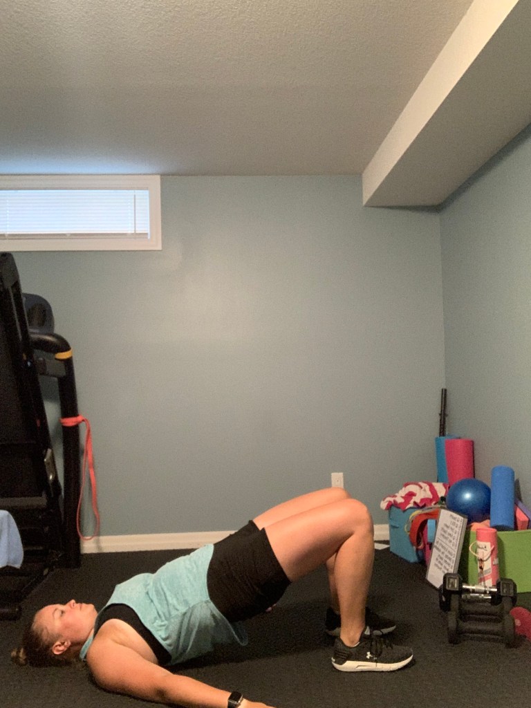 Glute Bridge: Begin lying on your back with your knees bent. If you pregnant get into this position by lowing yourself to your side and then roll onto your back (also use this method to get up off the floor as well). While laying on your back ensure that you are not experiencing feelings of lightheadedness or dizziness (if you experience symptoms laying on your back during pregnancy then aim to avoid laying directly on your back. Most women will be able to lay on their back throughout their pregnancy for short periods of time with no risk to baby). Engage your core and glutes and exhale as you lift your hips up squeezing your glutes at the top of the movement without arching through your back. Then lower your hips back to the floor returning to the start position.