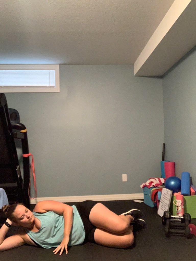 Clam Shell: Begin lying on your side with your knees and hips bent. If you are further along in your pregnancy your hips may not be bent as much which is perfectly fine, adjust as you need to in order to accommodate for the growing belly. Engage in your core and lift your top knee up squeezing in the glute at the top. Ensure that your hips stay stacked on top of each other at the top and that your top hip isn’t rolling backwards. Then lower your knee back down together with your bottom knee. Repeat on the opposite side.