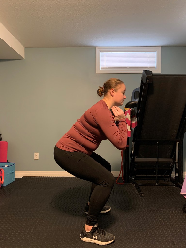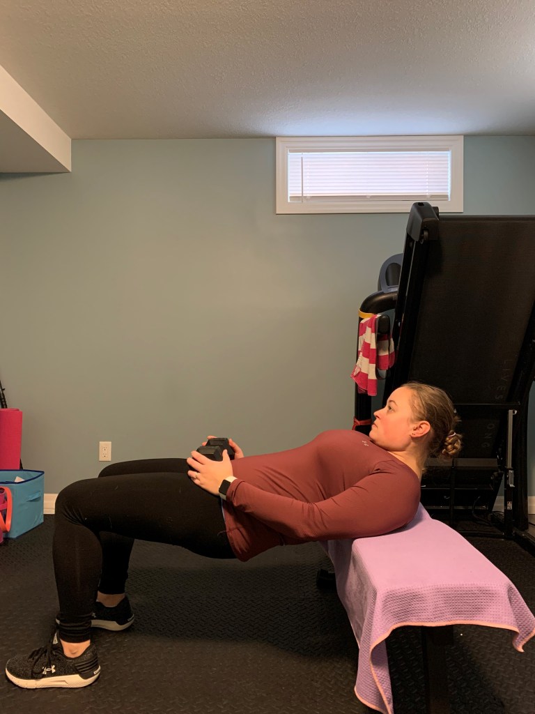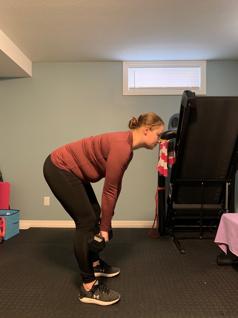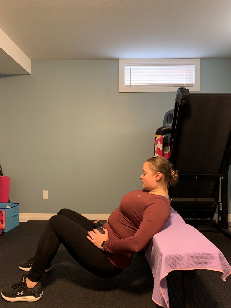 The workout is below. Each exercise includes a description and some additional notes or possible modifications if you are pregnant. If you are postpartum ensure that you have clearance from your doctor to begin this style of exercise. In early postpartum I would encourage some lower intensity exercises with this workout in mind to work towards as you reconnect to your core and gain strength back. Complete 8-12 reps of each exercise in a circuit style and repeat 2-3 times (or whatever you have time for).