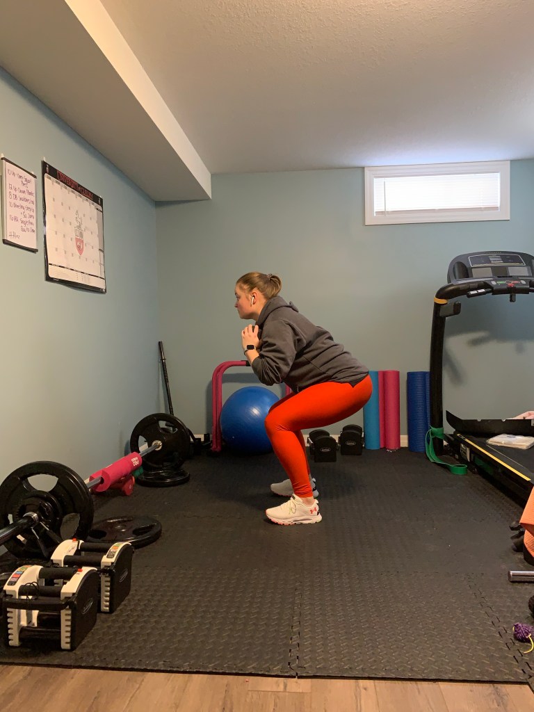 - Begin with your feet hip to shoulder width apart and take the dumbbell to your chest. Sit back into your squat like you would reach back for a chair behind by bending in the knees. Aim to keep your chest up and the weight close to your body. Drive through your heels and exhale as you return to your starting position.