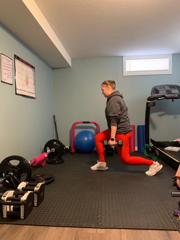 - Begin holding the dumbbell at your chest and start standing tall with your feet together about hip width apart. Step back with one foot and bend both knees to 90 degrees. Do not allow your back knee to touch the floor (instead hover just above the ground). Keep your chest upright as you step backwards. Once you have reached your 90 degrees, drive through both feet to return to the start position. Step back with the opposite leg on the next rep. Repeat until all reps have been completed on both sides.