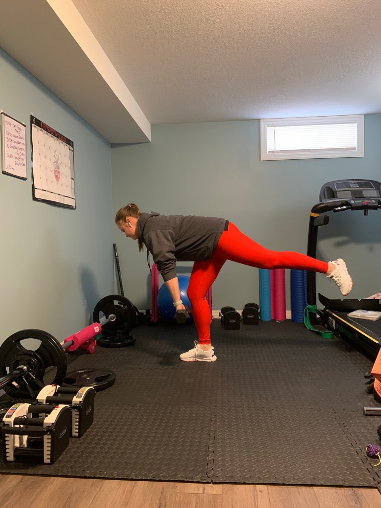 - Begin with the dumbbell in one hand in front of your thigh. The opposite side that you are holding the dumbbell will be your planted foot. Begin by hinging forward at the hips keeping the spine tall and the hips level. The back foot will lift out behind you as you tip forward. In a controlled manner return to the start position. Complete all reps on one leg and then switch sides. This exercise can be done supported as well if your balance is not strong enough to allow you to maintain good form.