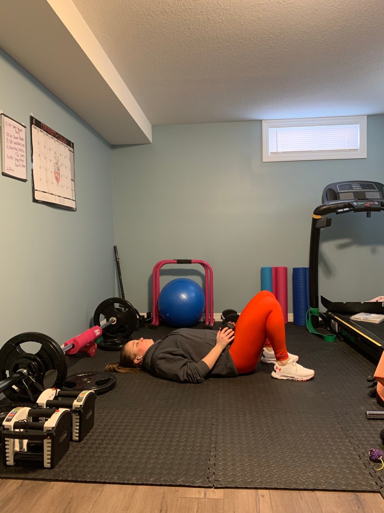 - Laying on your back place your dumbbell on your hips (if you have bony hips, you may want to place a mat between the dumbbell and your hips to give a little bit of padding). From this position activate your core and lift your hips up towards the ceiling. Pause at the top of the movement to squeeze your glutes and then lower back to your start position.