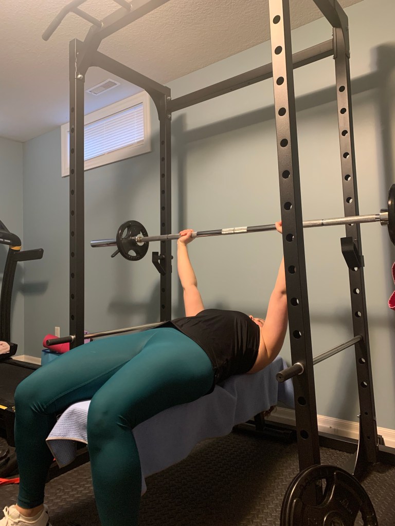 The Bench Press is a great pushing exercise to help develop the chest muscles. Like with the squat set up for the bench press is important. When setting up the bench press you want to ensure that the safety bars are set to an appropriate height that if you let go of the bar it will rest on the safety arms and not on tope of you, however you also want to ensure that you are not hitting the safety arms at the bottom, or that they are preventing you from reaching full range of motion. Once you know you have the safety bars set correctly you can get into position for the bench press. Laying on your back on the bench lift the bar from the holds and bend at the elbow lowering the bar towards your chest. Try to ensure that your wrists stay neutral and that your elbows stay in towards your sides slightly (avoid the chicken wings). Once you have touched your chest push the barbell away from you to return to your start position.