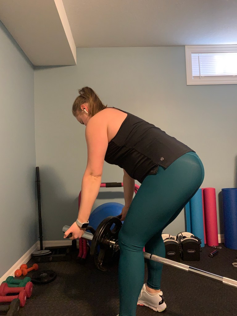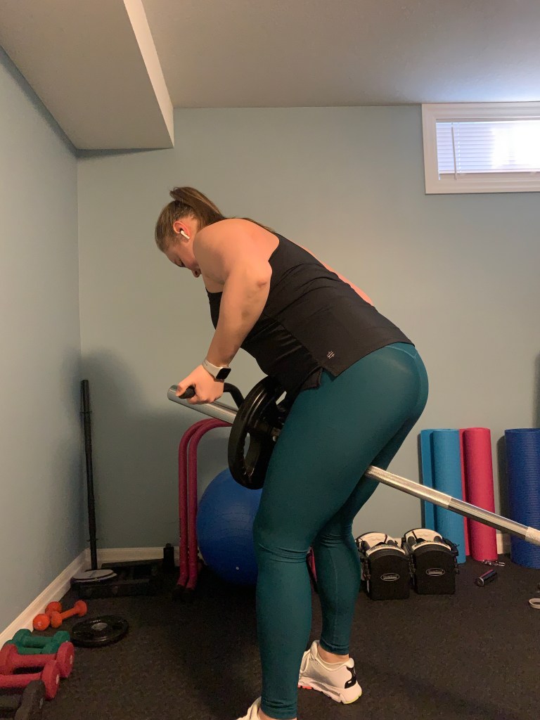 The Deadlift is such a great movement to target the glutes and hamstrings. With the deadlift ideally you are lifting with bumper plates (these are plates that are different weights but all the same size as a standard 45lbs plate). I don’t have bumper plates in my home gym so I make do with what I have, but if you have access to them then I would use them. You can also use Yoga blocks if you don’t have bumper plates and need a bit more elevation of the bar! It’s important to remember that when you are deadlifting the movement is a hinge based movement and not a squat (most of the movement should be coming through your hips). You want to keep the bar nice and close to your shins and your shoulders over the bar. Before you begin the movement pull the slack out of the bar (by pulling up on the bar slightly) and then begin your lift. As you lift keep the bar close to you and think about pushing the floor away. Keep your back in a neutral spine position as you lift (you should be aiming to avoid rounding in the back) and your core tight throughout the movement. At the top of the movement lower the bar back to floor continuing to brace and maintain neutral spine leading the movement with the hips.