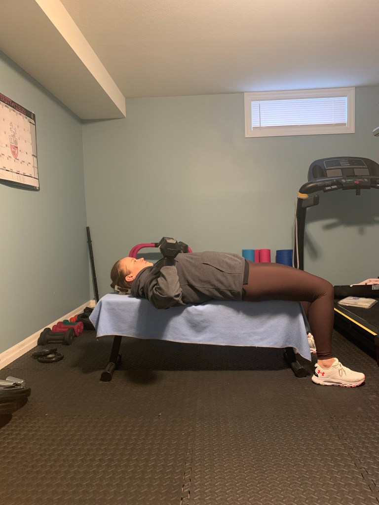 If you have a bench or an elevated surface you can use it for this move, however if that’s not available to you then you can also do the chest press from the floor. Begin laying on your back with the dumbbells straight up over top of you. Bending at the elbows and keeping your elbows tucked in slightly lower the weights towards your chest and you inhale. At the bottom begin to exhale and push the weights back up and away from you. Keep your core tight throughout the movement and your feet firmly on the floor (as long as that’s comfortable for you).