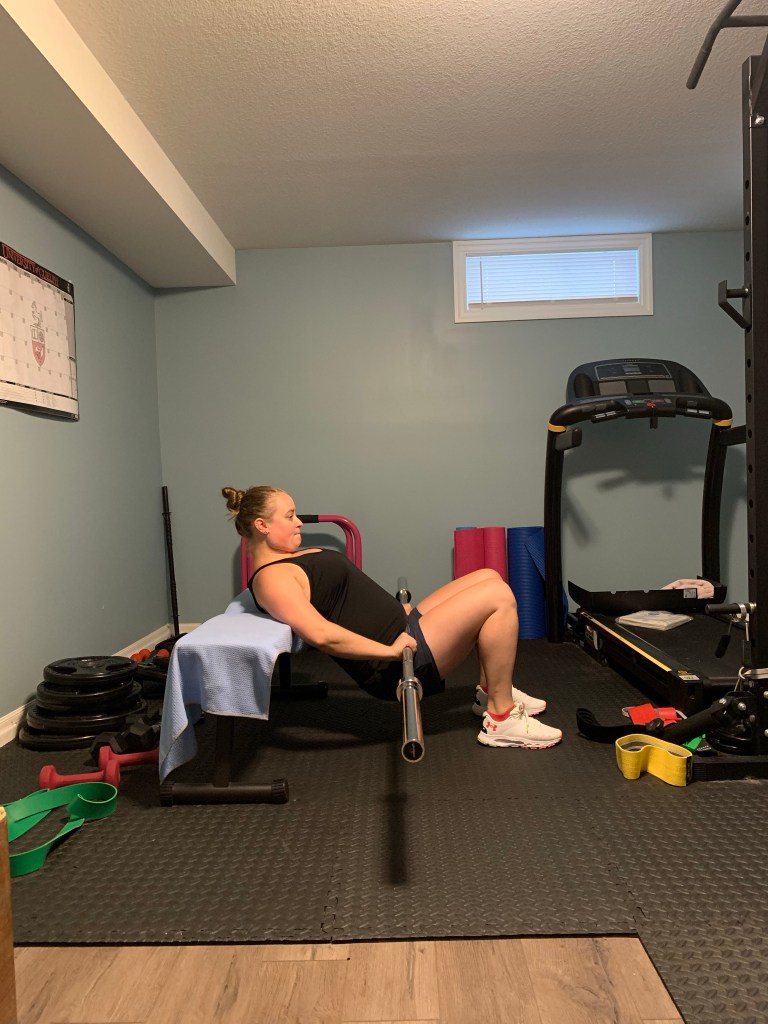 On a bench ensure that you position just under your shoulder blades on a bench behind you. Ensure that you are using 45 lbs plates or bumper plates for this movement so that you are able to easily roll the bar over your legs to your hips. Position your feet in a position so that when your hips are fully extended your knees are over top of your hips. Beginning from the bottom of the movement your butt will be close to the floor. Squeeze through the glues and extend through the hips to generate a table top position at the top of the movement. Keep your feet flat on the floor throughout the movement. At the top of the movement squeeze the glutes and then slowly lower your hips back to the start position in a controlled manner.