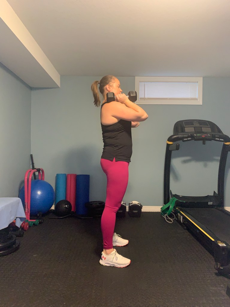 Taking a dumbbell in each hand bring them up to your shoulders while keeping your elbows high. Reach your hips backwards like you are reaching your butt back towards an imaginary chair behind you. Keep your weight evenly distributed throughout your feet. Aim to get your thighs parallel with the floor or a 90 degree bend at the knee (not everyone will be able to get this initially and that’s okay, if you don’t have it yet just ensure you are focusing on range of motion when you practice your squatting movements). Ensure that you keep your chest high as you drop down into position. At the bottom of the movement, drive through your feet evenly and stand back up to your start position.