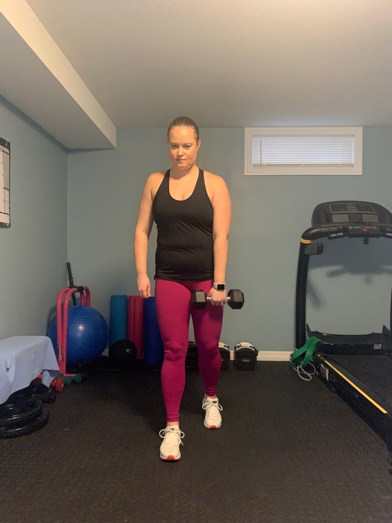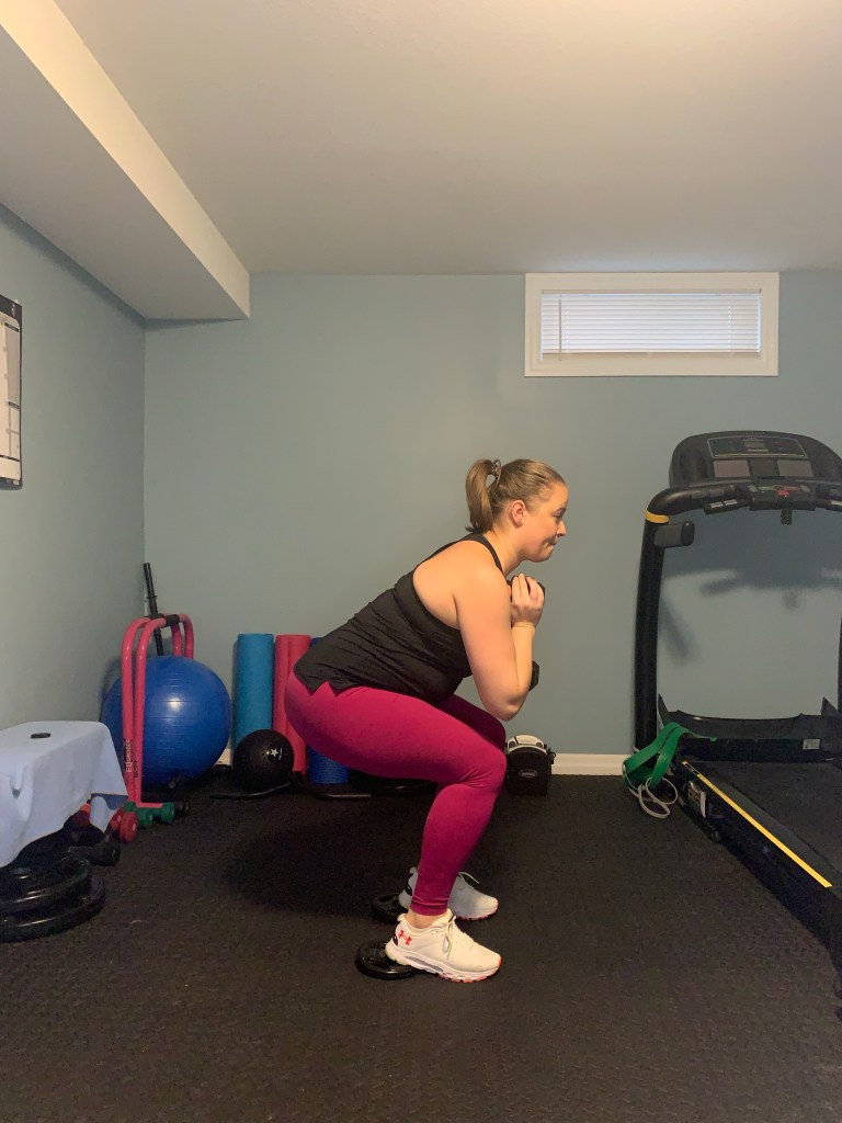 Place small plates on the floor and put your heels on the plates with your toes remaining on the floor. Then take a dumbbell or kettlebell in your hands, hold it close to your chest and reach your hips backwards like you are reaching your butt back towards an imaginary chair behind you. Keep your weight evenly distributed throughout your feet. Aim to get your thighs parallel with the floor or a 90 degree bend at the knee (not everyone will be able to get this initially and that’s okay, if you don’t have it yet just ensure you are focusing on range of motion when you practice your squatting movements). Ensure that you keep your chest high as you drop down into position. At the bottom of the movement, drive through your feet evenly and stand back up to your start position.