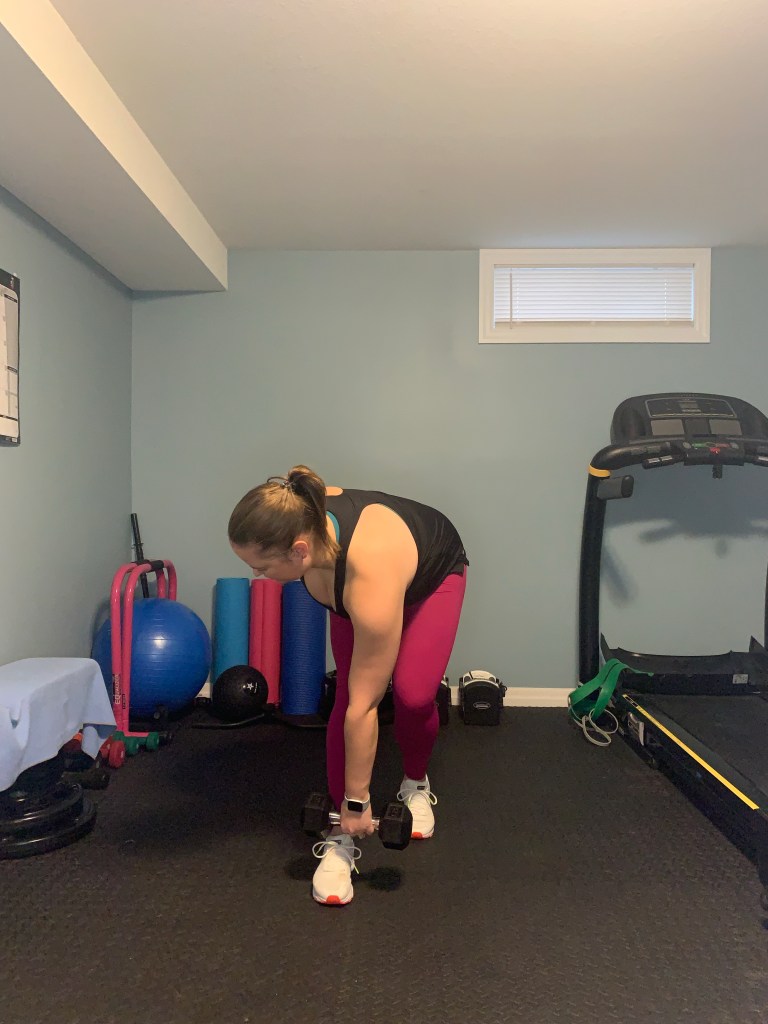 Take a dumbbell in one hand to the front of your body. Step back with one same foot as the dumbbell is in to create a kickstand. Stand tall with a slight bend in the knee of the leg that’s forward and put your weight over your front leg. Drive your hips backwards keeping your leg relatively straight while rotating the dumbbell towards your forward foot. Even though you are rotating your spine should still stay neutral as you push your hips backwards and you should avoid rounding through the spine. At the bottom of the movement squeeze the glutes and drive the hips forward and rotate slightly to stand back up to your starting position.