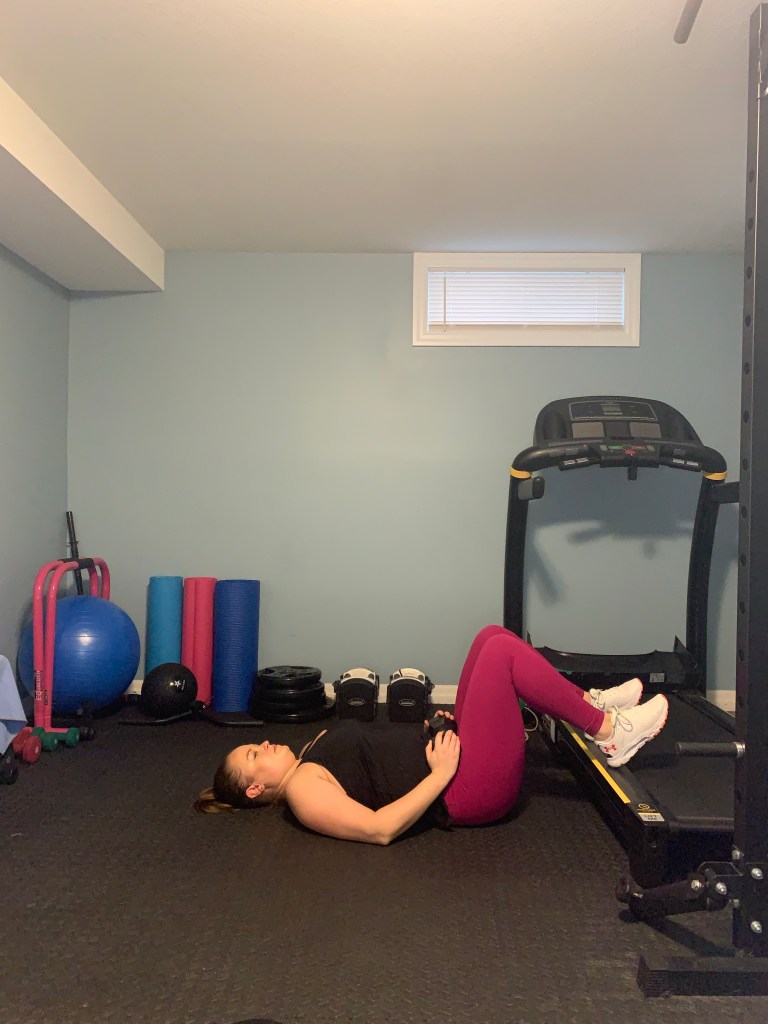 Begin by laying on your back on the floor with a dumbbell positioned on your hips and your heels on a step or a slightly elevated surface. If the dumbbell is causing pain on your hips try placing a mat between the dumbbell and your hips to provide a bit of cushioning. Begin the movement by lifting your hips towards the sky keeping your core active and driving through evenly through your feet. Your core and glutes should be active through the movement and you should feel a glute squeeze at the top of the movement. Ensure that you fully extend through the hips, but avoid arching in the low back when you do this. At the end range of motion return in a controlled manner to the floor.