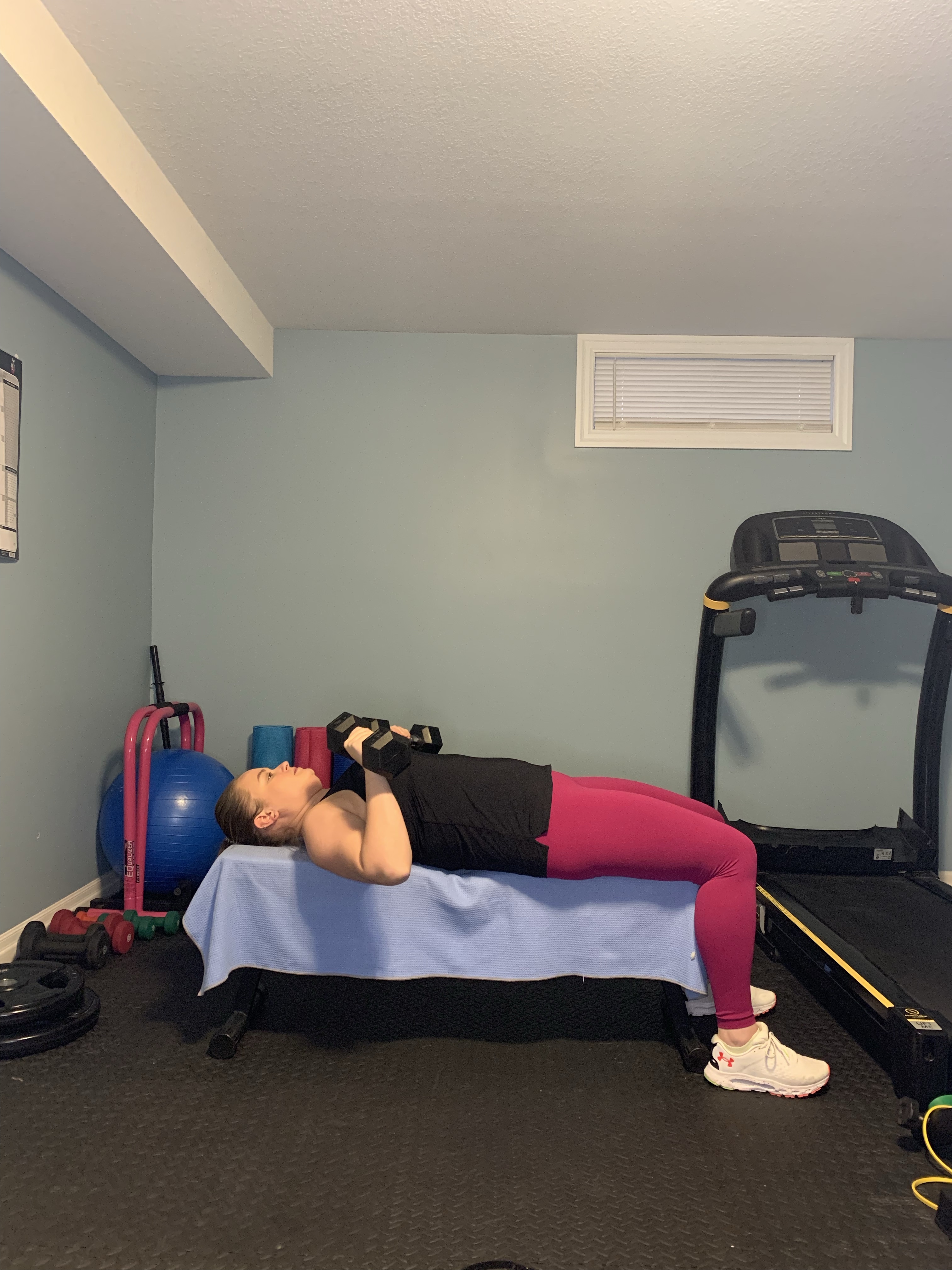 Lying on a bench or the floor, take a dumbbell in each hand. Bend at the elbow keeping your elbows closer to the body and avoid flaring them to the side (they don’t need to be glued to your side, just avoid having chicken wings straight out to the side). Ensure that you lower the dumbbells at the same pace keeping your hands together. At the bottom of the movement push the dumbbells away from your chest to the start position with full extension of the elbows (you don’t need to lock your elbows out at the top).
