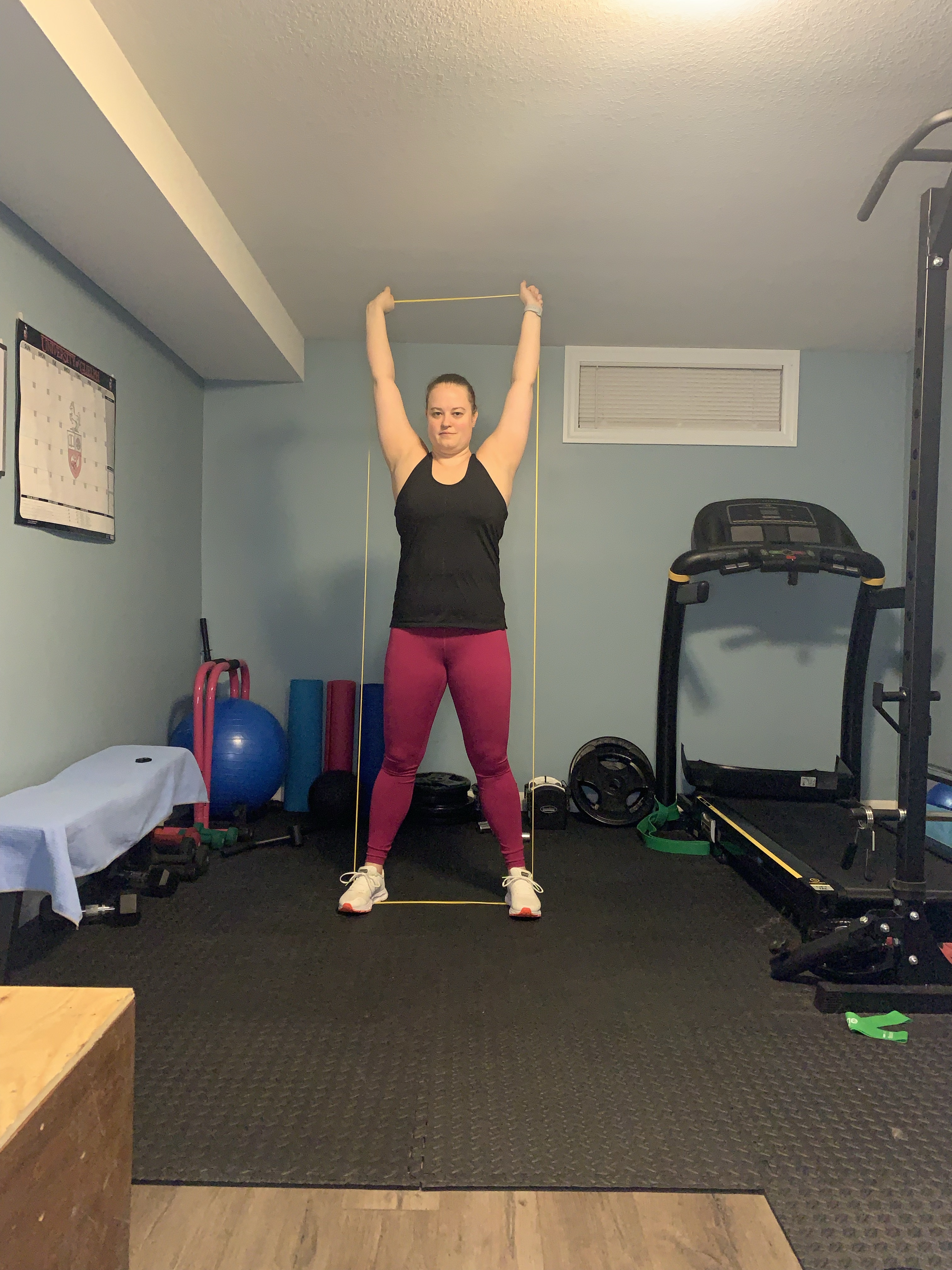 Begin by anchoring the band securely over your head (the top of a squat rack or the top of a door frame works great for this). Take the band in both hands and tuck the elbows to the side. Extending at the elbow while they stay at your side push the band down toward the floor. Return to the start position in a controlled manner.