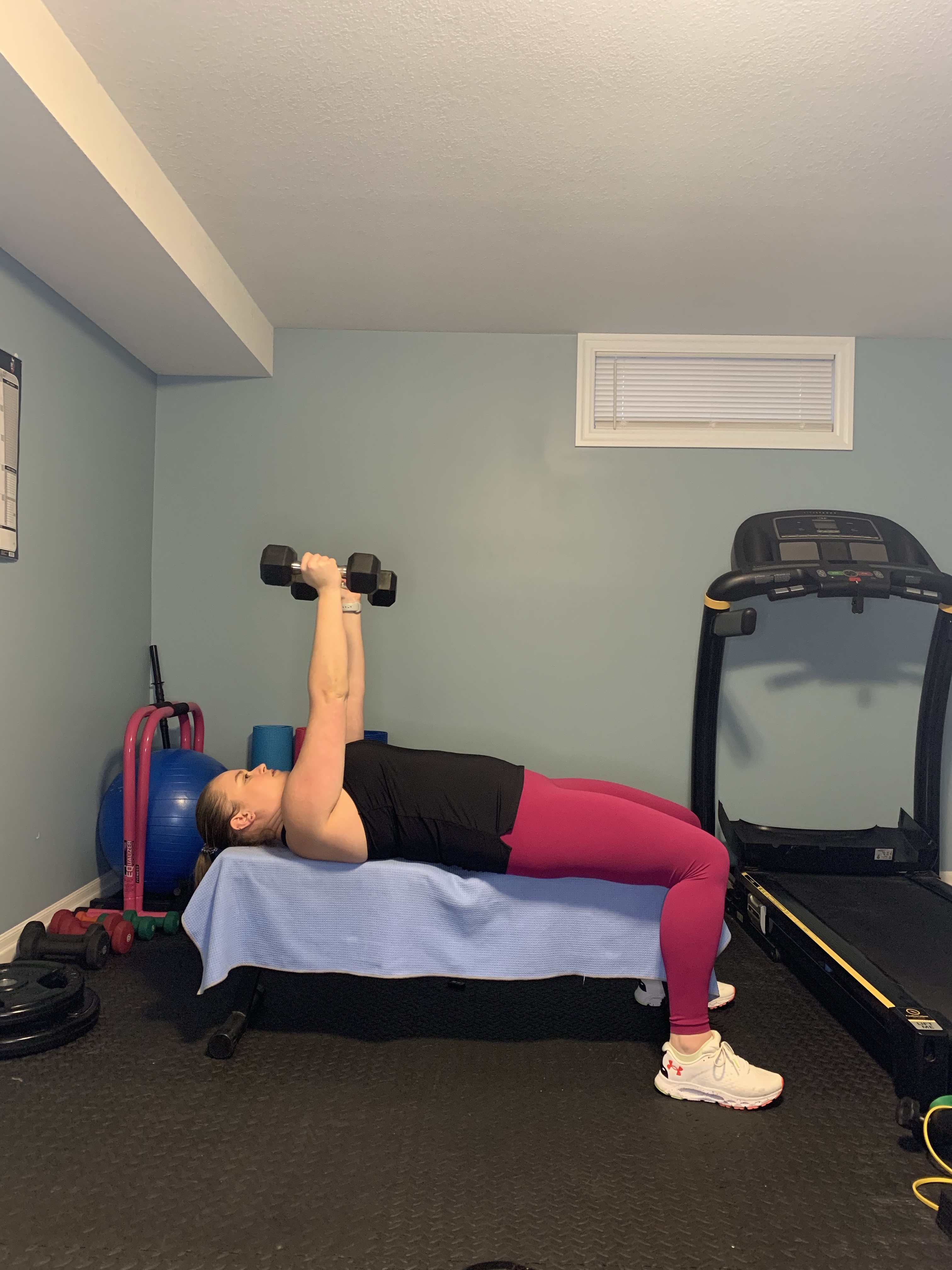 Laying on your back on a bench begin with either a single dumbbell held at the ends or two dumbbells (on in each hand) straight up over your chest. Bending at the elbow bring the single dumbbell to your forehead, or the two dumbbells to either side of your head keeping your upper arm stationary. Aim to achieve at least a 90 degree bend in your elbow (or go to your end range of motion) and then return to your start position by extending through the elbow.