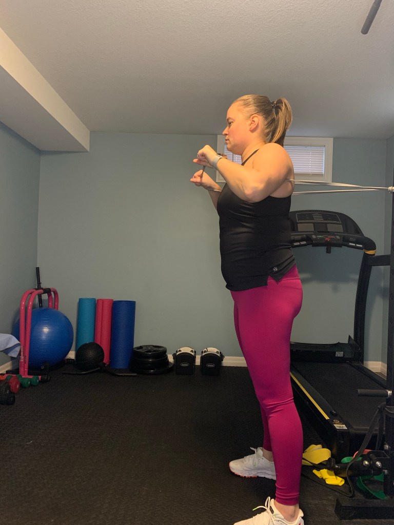 Anchor the band around something secure at chest height. This exercise can be performed from a standing or kneeling position depending on what you have access to. Once the band is securely anchored, step inside the band and bring it to your chest height. Keeping your elbows slightly tucked in position the band in front of your chest and push it away from you by extending at the elbows. At the end of the movement bend through the elbows to return to the start position.