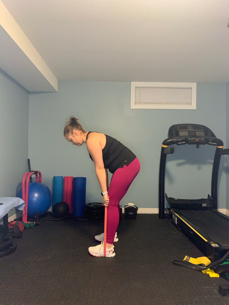 Standing on the band with your feet about hip width apart, stand tall with a slight bend in the knee. Drive your hips backwards keeping your leg straight. Keep your spine neutral as you push your hips backwards and avoid rounding the spine or in the shoulders. At the bottom of the movement squeeze the glutes and drive the hips forward to stand back up and return to the start position.