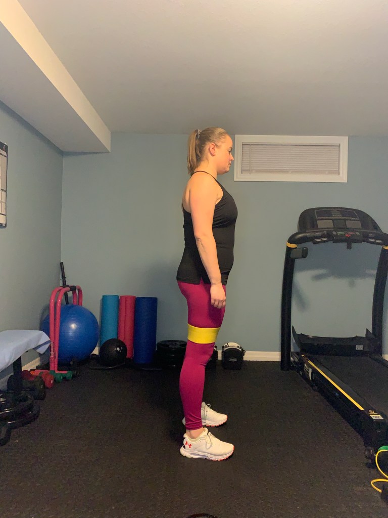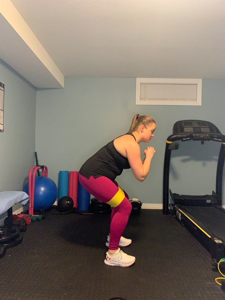 Placing the band around your legs just above your knees start by reaching your hips backwards like you are reaching your butt back towards an imaginary chair behind you. Keep your weight evenly distributed throughout your feet. Aim to get your thighs parallel with the floor or a 90 degree bend at the knee (not everyone will be able to get this initially and that’s okay, if you don’t have it yet just ensure you are focusing on range of motion when you practice your squatting movements). Ensure that you keep your chest high as you drop down into position. At the bottom of the movement, drive through your feet evenly and stand back up to your start position.