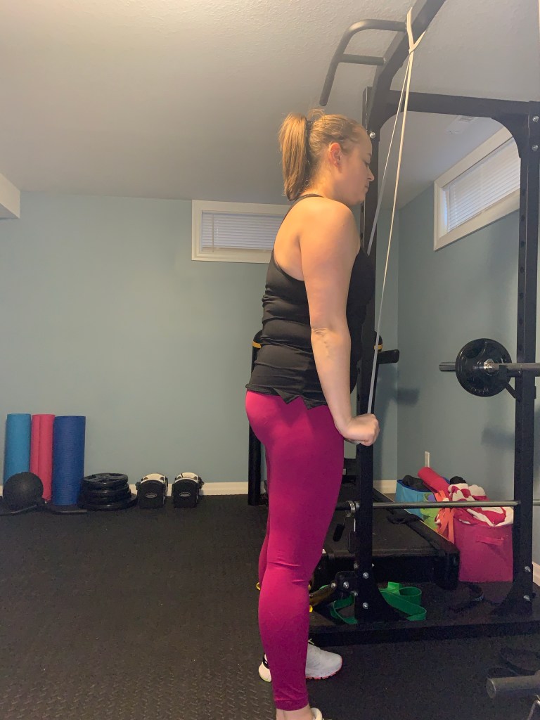 Begin by anchoring the band securely over your head (the top of a squat rack or the top of a door frame works great for this). Take the band in both hands and tuck the elbows to the side. Extending at the elbow while they stay at your side push the band down toward the floor. Return to the start position in a controlled manner.