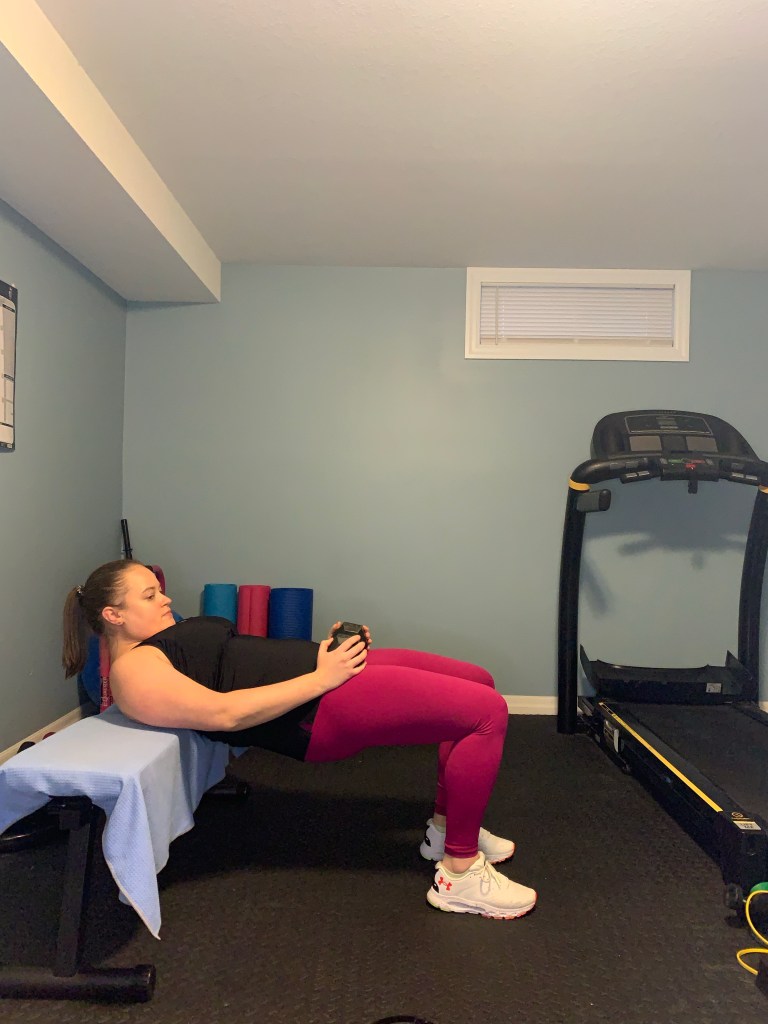 Place just under your shoulder blades on a bench behind you and bring a dumbbell to your hips. Place your feet in a position so that when your hips are fully extended your knees are over top of your hips. Beginning from the bottom of the movement your butt will be close to the floor. Squeeze through the glutes and extend through the hips to generate a table top position at the top of the movement. Keep your feet flat on the floor throughout the movement. At the top of the movement squeeze the glutes and then slowly lower your hips back to the start position in a controlled manner.