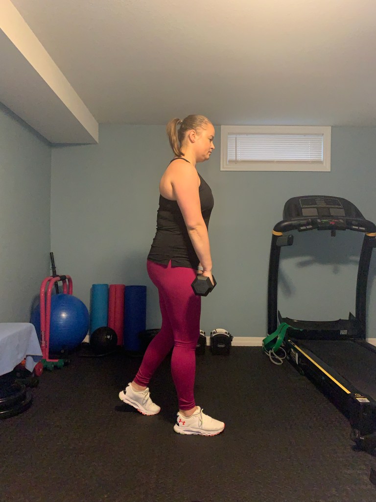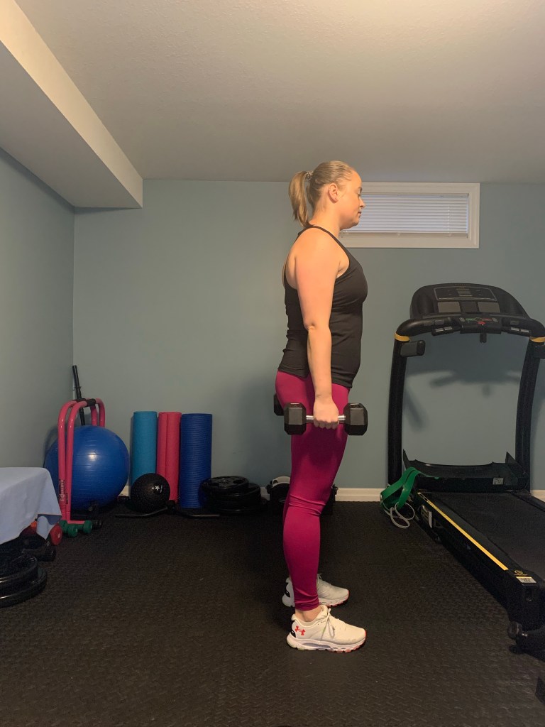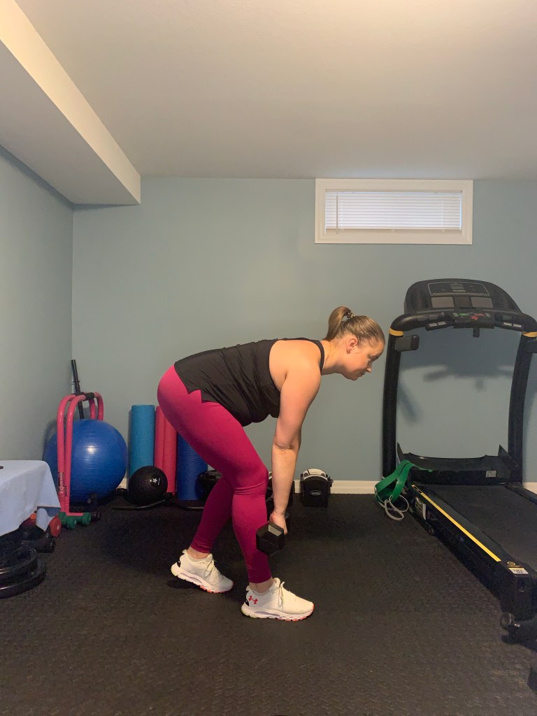Take a dumbbell in each hand to the front of your body. Step back with one foot slightly creating a kickstand. Stand tall with a slight bend in the knee of the leg that’s forward with all your weight over your front let. Drive your hips backwards keeping your leg relatively straight. Keep your spine neutral as you push your hips backwards and avoid rounding the spine or in the shoulders. The bottom range of motion will vary for everyone, but most people will want to stop just below their knees (if you have perfect form and want to go further go for it). At the bottom of the movement squeeze the glutes and drive the hips forward to stand back up and return to the start position.