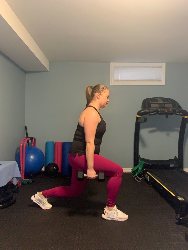 Taking a dumbbell in each hand begin with your feet together side-by-side. Step one foot back behind you and bend both your front and your back knee lower into the lunge. Your goal is to achieve a 90 degree angle at both your front and your back knee. At the bottom of the movement drive through both feet (front and back) and return to the standing position. Alternate legs completing the desired number of reps on both legs.
