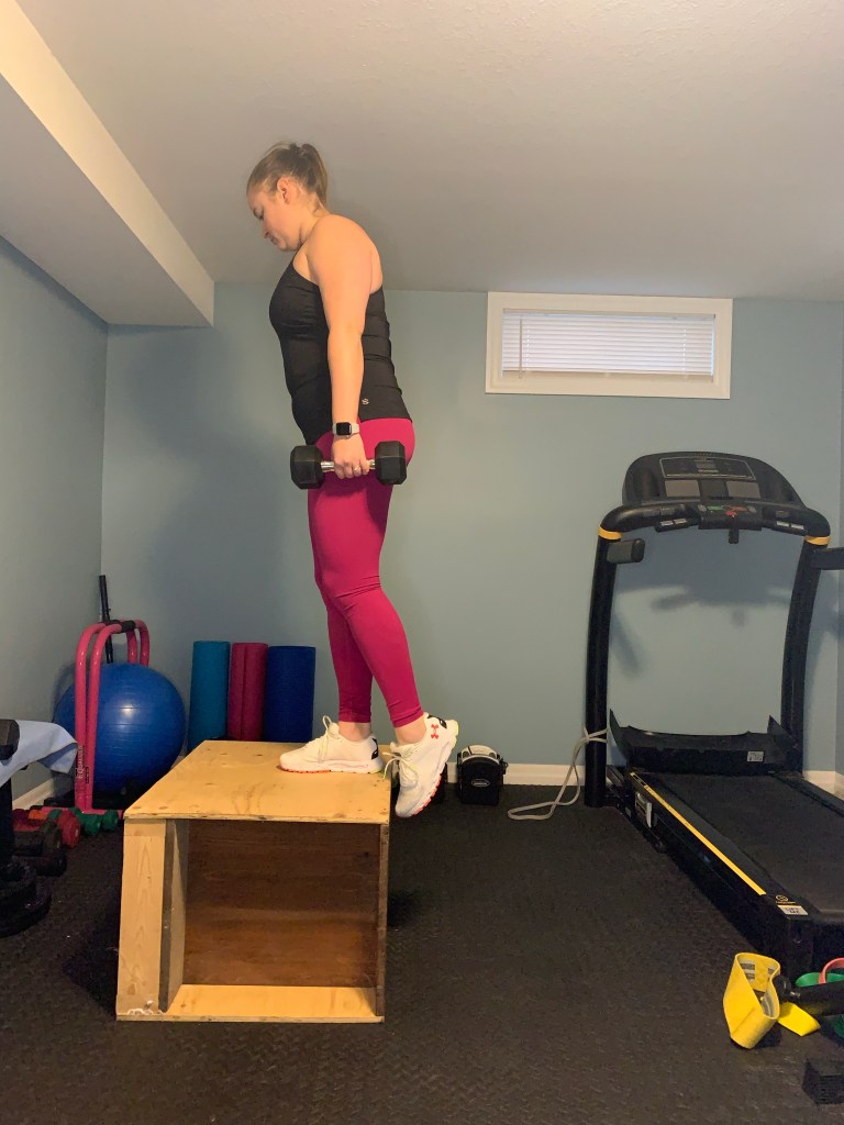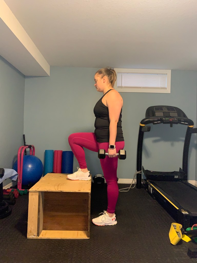 Start standing beside a solid box or bench that you can step up onto with a dumbbell in one hand (opposite hand to the leg you are stepping up with). Place one foot fully on top of the surface then lean your nose over your toes and stand up on the box or bench. At the top of the movement begin to lower yourself back to the floor in a controlled manner (this should be slow and steady, you aren’t falling back to the floor). Return to the floor fully and then repeat, complete all reps and then switch sides.