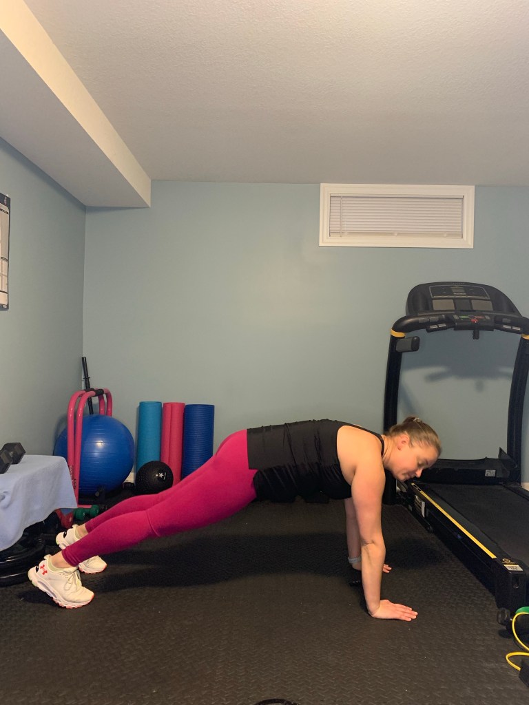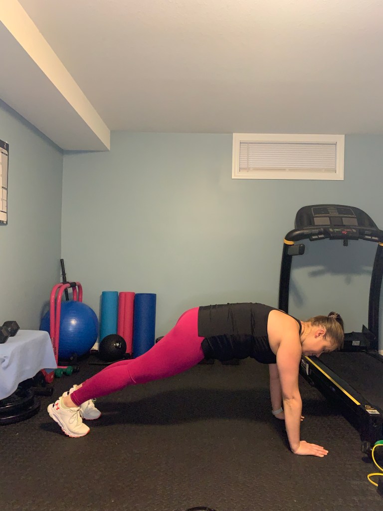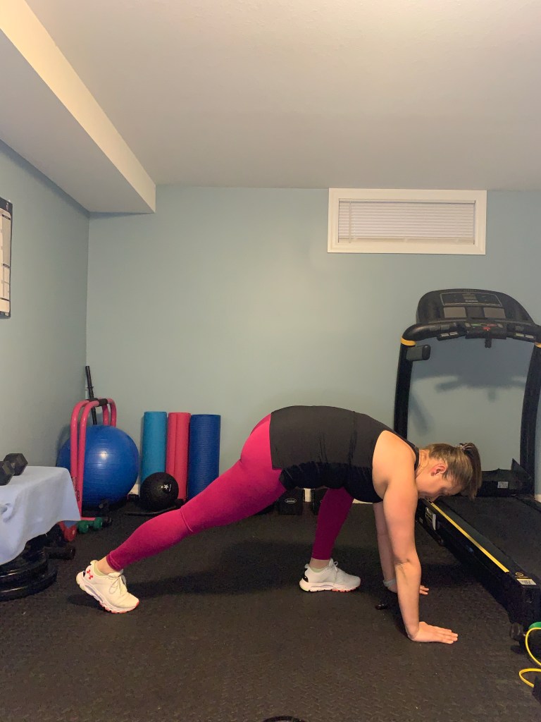Begin in a tall plank position with your feet slightly wider to give you a solid base. Ensure that your core is active in order to maintain the appropriate plank position. Once you have established a strong plank position, maintain core activation while lifting one hand off the floor and reaching up to touch the opposite shoulder. Return the hand back to the ground and repeat on the opposite side. While lifting and lowering your hands aim for little to no movement in the hips by keeping the core engaged through the entire movement.