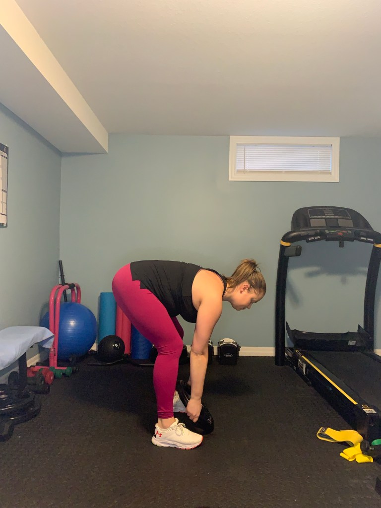 Begin standing tall with your feet hip to shoulder width apart and a plate held between your two hands. By driving your hips backwards in a hip hinge motion, move the plate towards the floor tapping the edge of the plate on the floor at the bottom of the movement. Engage in the glutes and hamstrings to return to a standing position while pushing the plate up over your head. You will end with the plate straight up over your head. Begin to lower the plate from over your head to return to the initial movement and repeat for desired reps.