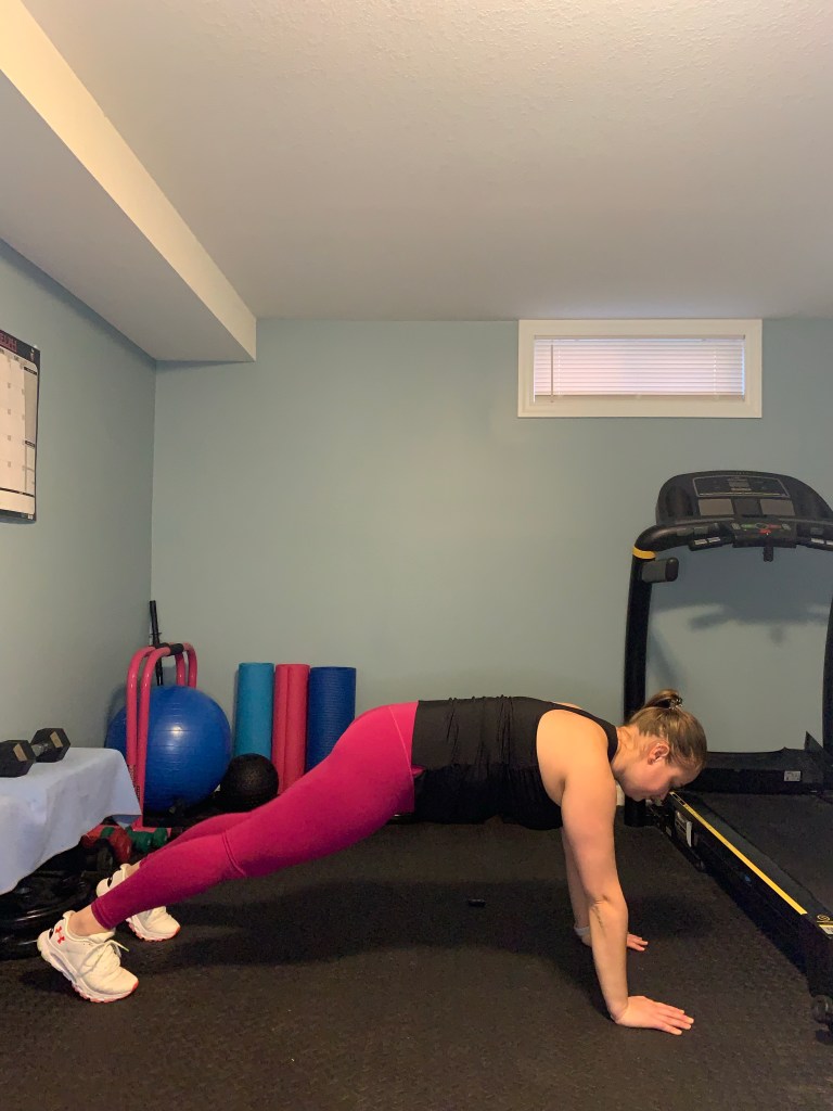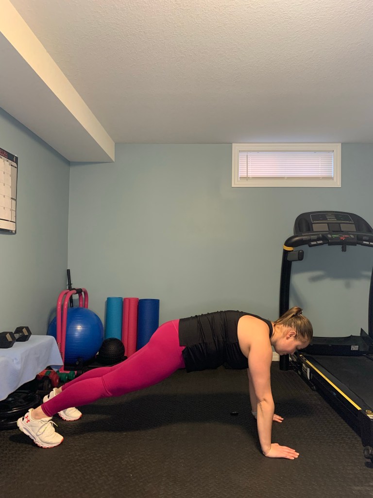 Begin in a high plank position with your hands right underneath your shoulders, your core active and a neutral spine. Keeping your core active to maintain little rotation at the hips lower from one hand to the elbow and repeat the same thing on the opposite side. Once both elbows are on the floor return to the high plank position by lifting off the elbow back onto the hand and repeating on the other side. This movement can be done from the knees as well if required.