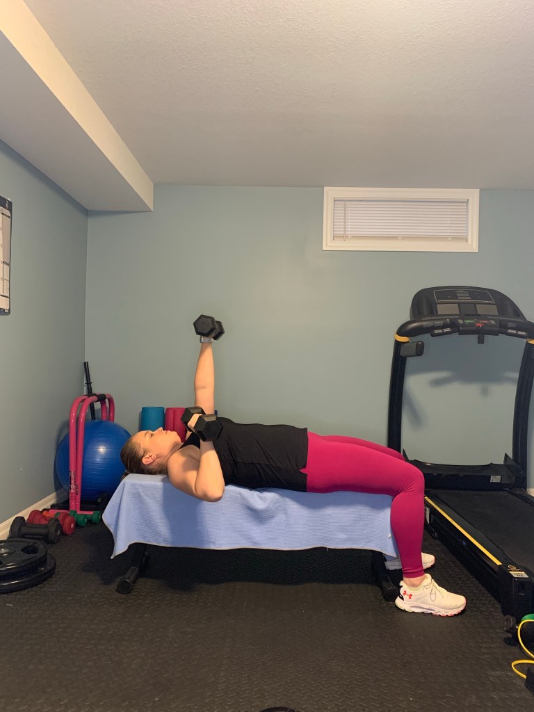 Lying on a bench, take a dumbbell in each hand. Bend at one elbow keeping it closer to the body and avoid flaring it to the side (it doesn’t need to be glued to your side, just avoid having chicken wings straight out to the side). At the bottom of the movement push the dumbbell away from your chest to the start position with full extension of the elbows (you don’t need to lock your elbows out at the top). Upon return, repeat on the opposite side.