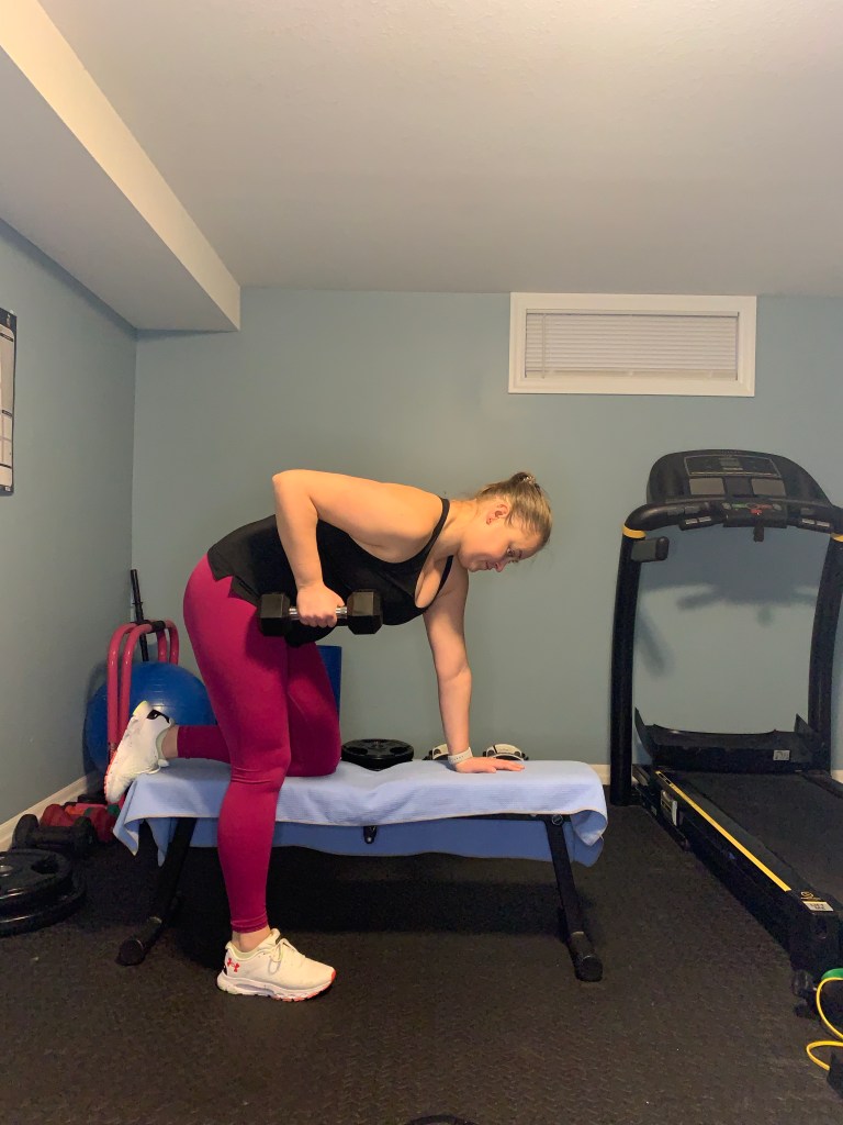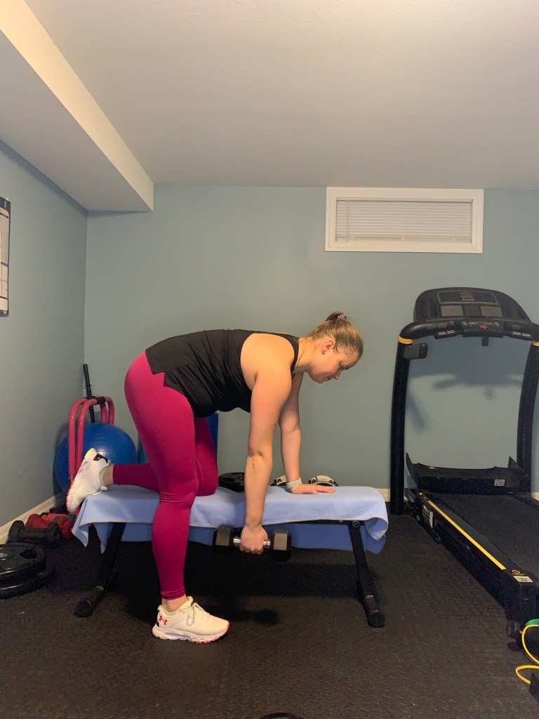 Position one hand and one knee on a bench taking a dumbbell in the opposite hand. Keep your spine neutral in this position with the dumbbell hanging in the opposite hand. Pull the elbow backwards towards your hip while squeezing the shoulder blade towards the opposite shoulder blade at the top. Keep the core tight as you lower the weight in a controlled manner back to the start point. Complete all reps and then repeat on the opposite side.