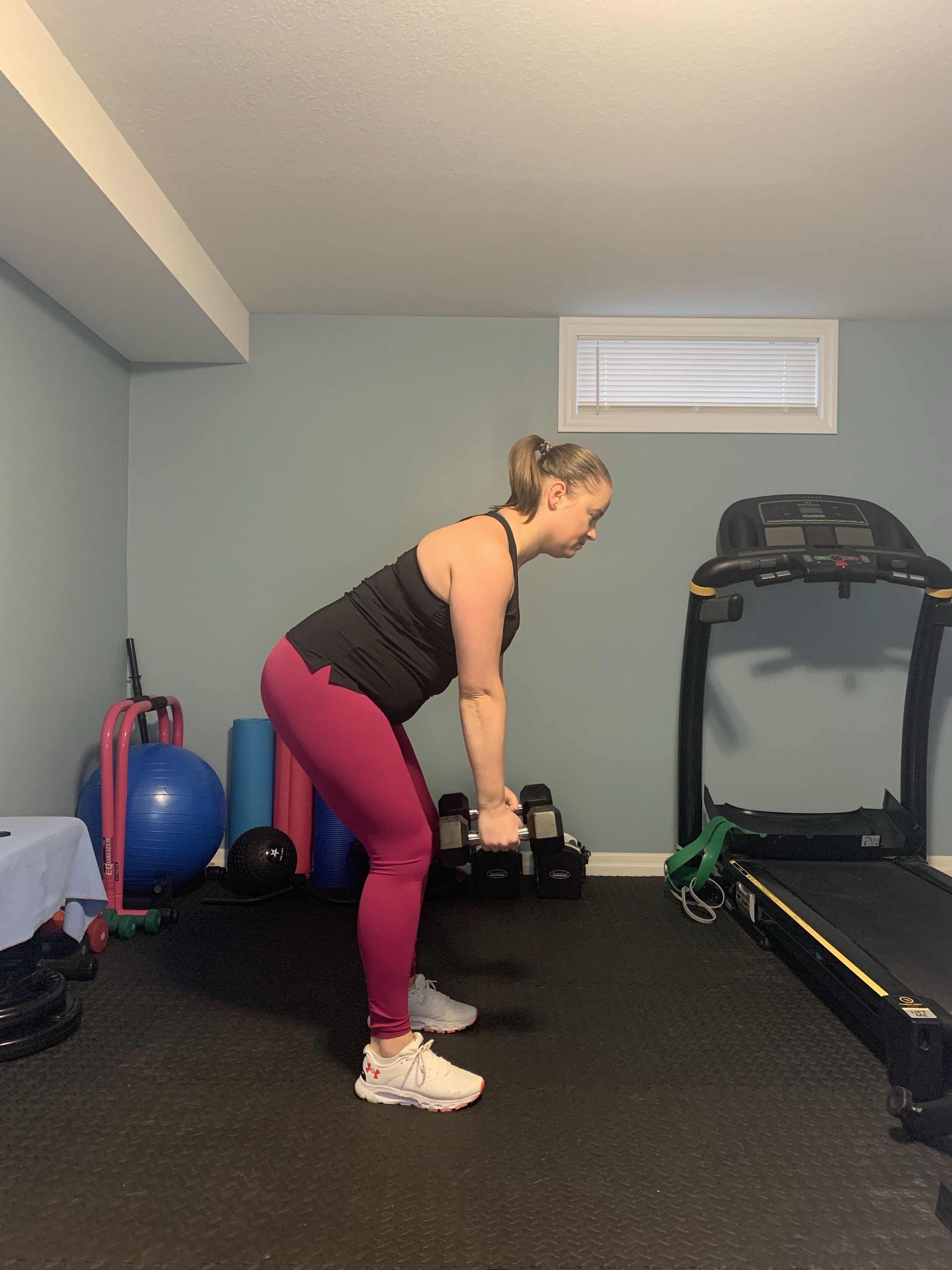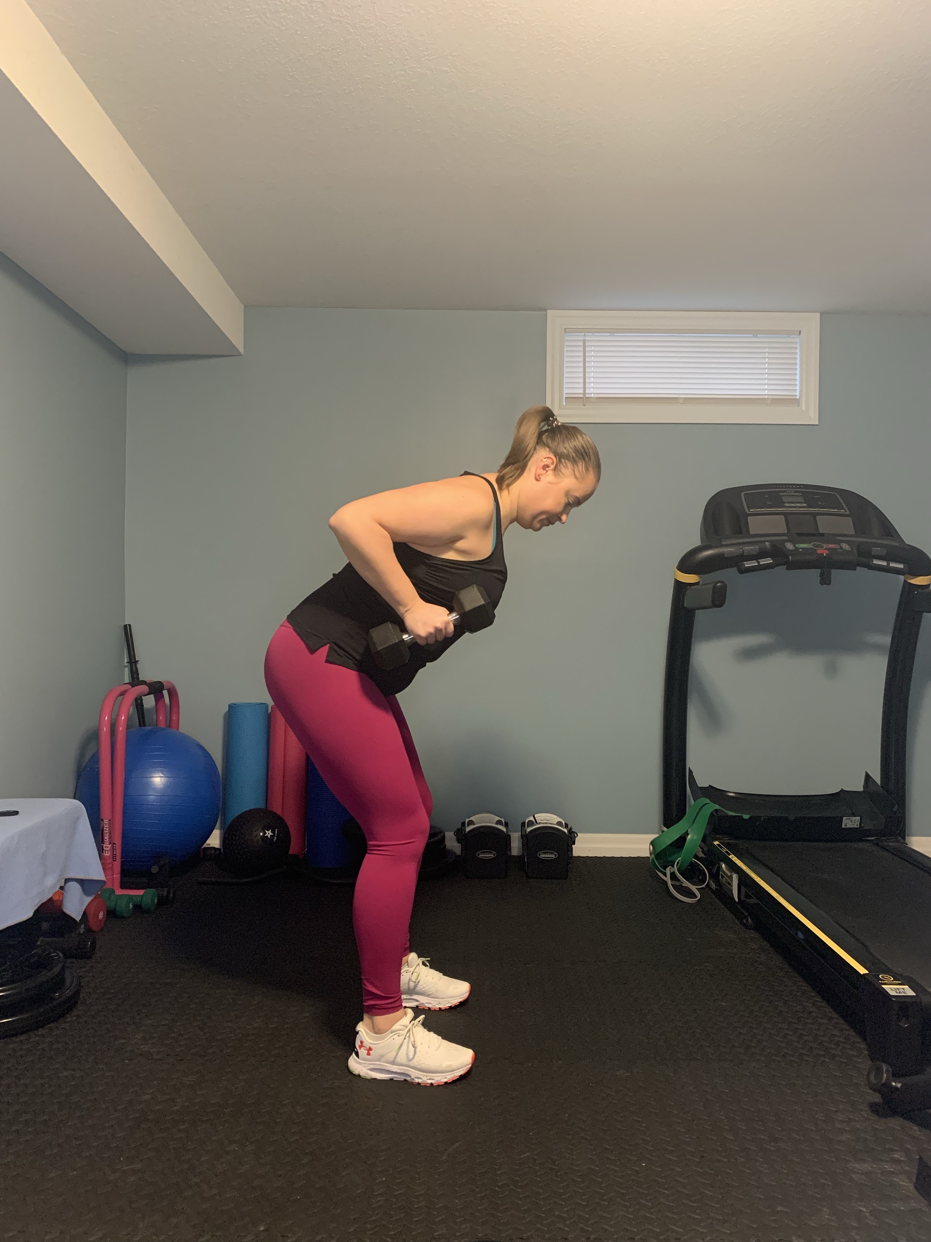 Begin taking one dumbbell in each hand with a shoulder to hip width stance. Hinge at the hips leaning forward and sticking your butt out. Your spine should remain tall when you do these and there should be no rounding other than the natural curves of your spine. Begin with your arms hanging straight down from this hinged position. Start the movement by rowing your elbows back and squeezing your shoulder blades together (imagine there is a pencil between your shoulder blades and you are trying to hold it in place. Ensure your core is engaged and your spine stays tall as you row the elbows back. In a controlled manner lower the dumbbells back down to your start position.