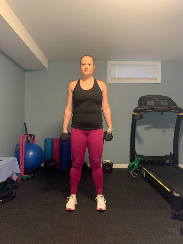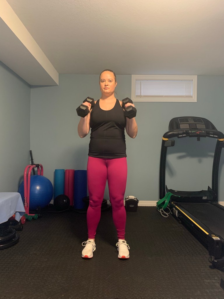 Take a dumbbell in each hand and engage your core before you start the movement. With your palms facing inwards or each other bend at the elbow and curl the dumbbells up towards your collar bone. At the top of the movement, return to the start position in a controlled manner.