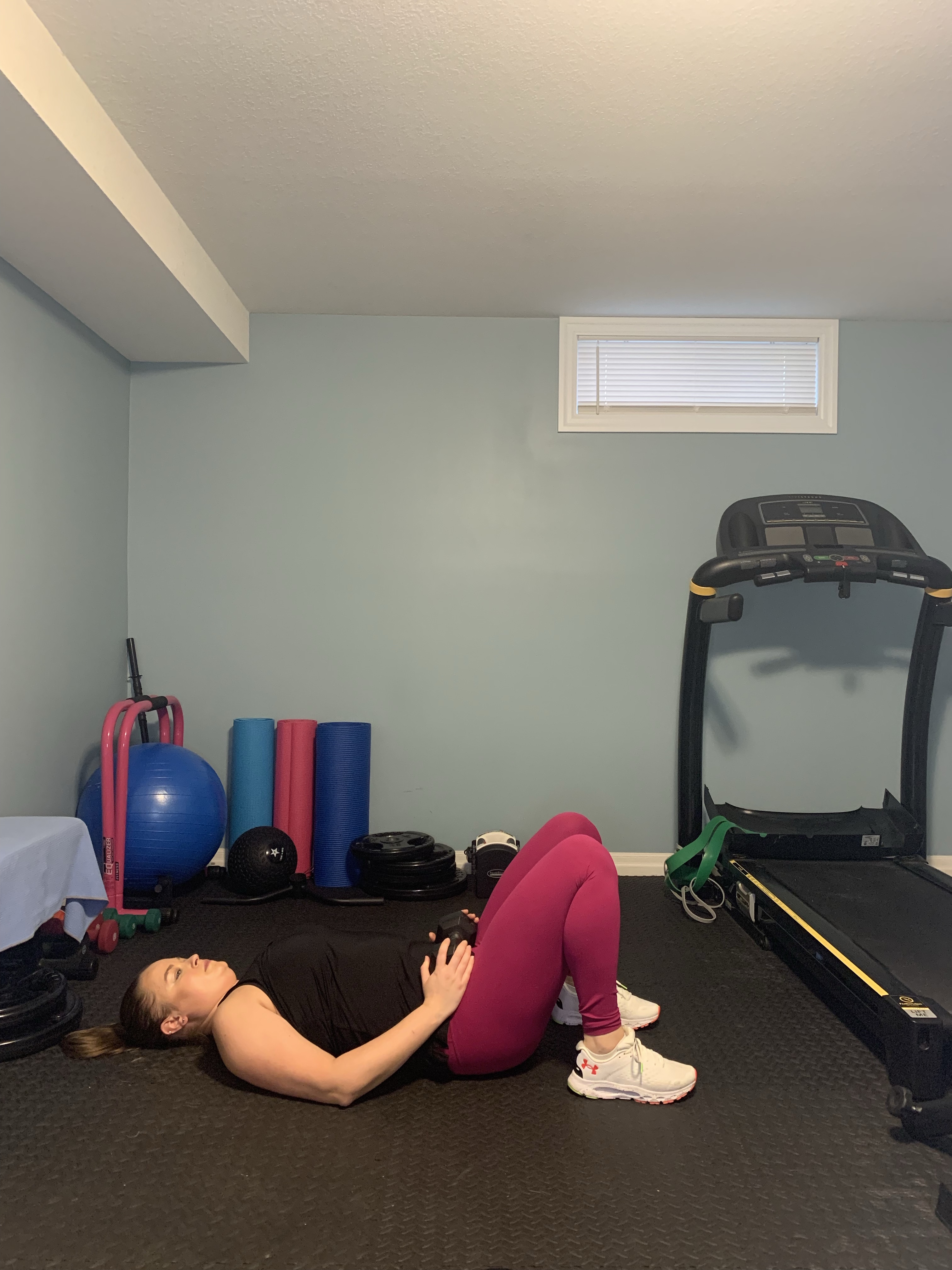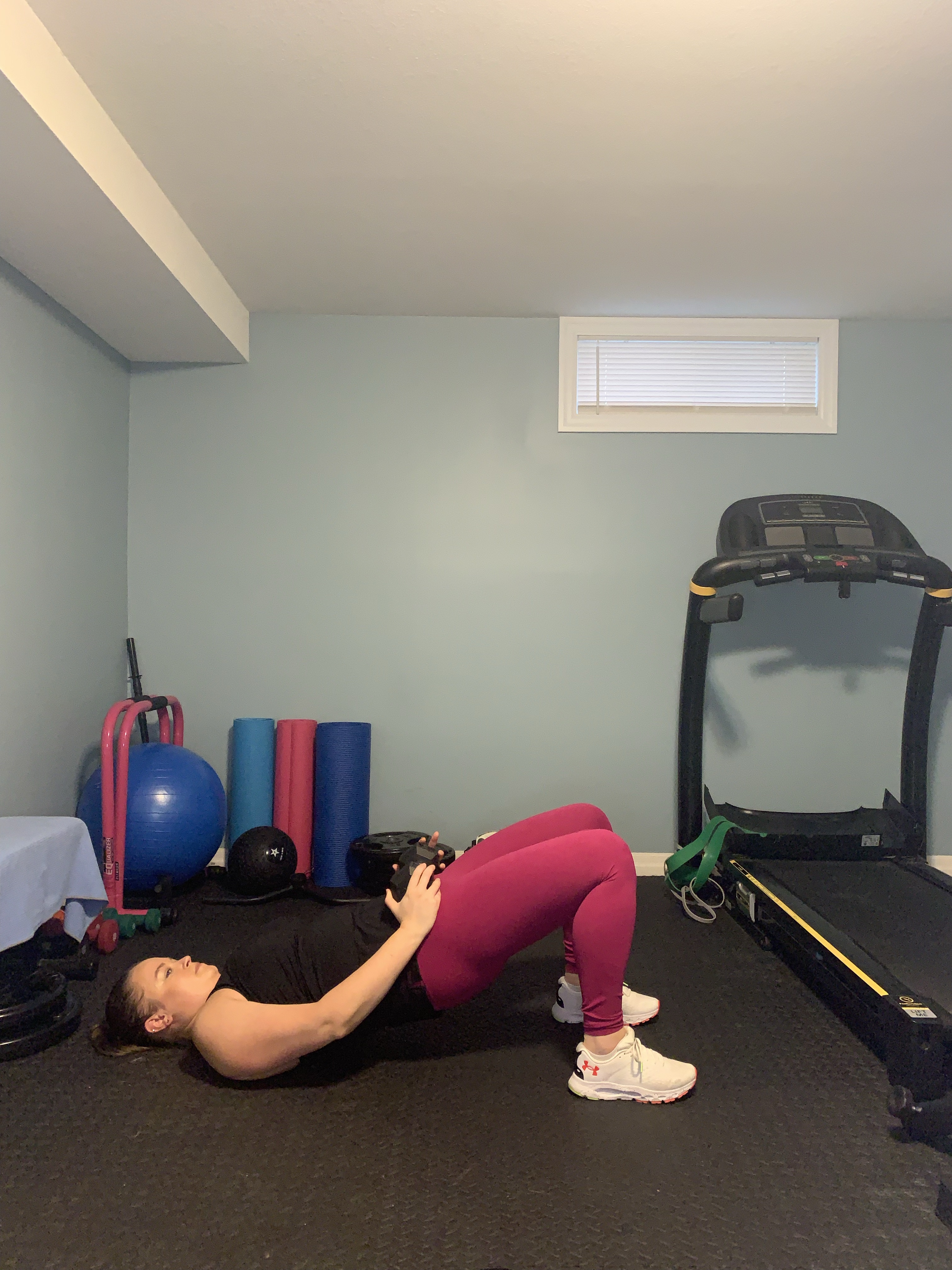 Begin by laying on your back on the floor with a dumbbell positioned on your hips. If the dumbbell is causing pain on your hips try placing a mat between the dumbbell and your hips to provide a bit of cushioning. Begin the movement by lifting your hips towards the sky keeping your core active and driving through evenly through your feet. Your core and glutes should be active through the movement and you should feel a glute squeeze at the top of the movement. Ensure that you fully extend through the hips, but avoid arching in the low back when you do this. At the end range of motion return in a controlled manner to the floor.