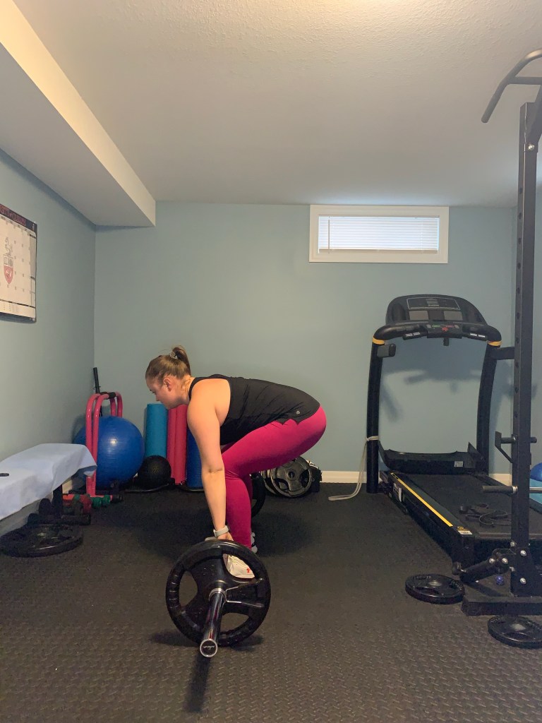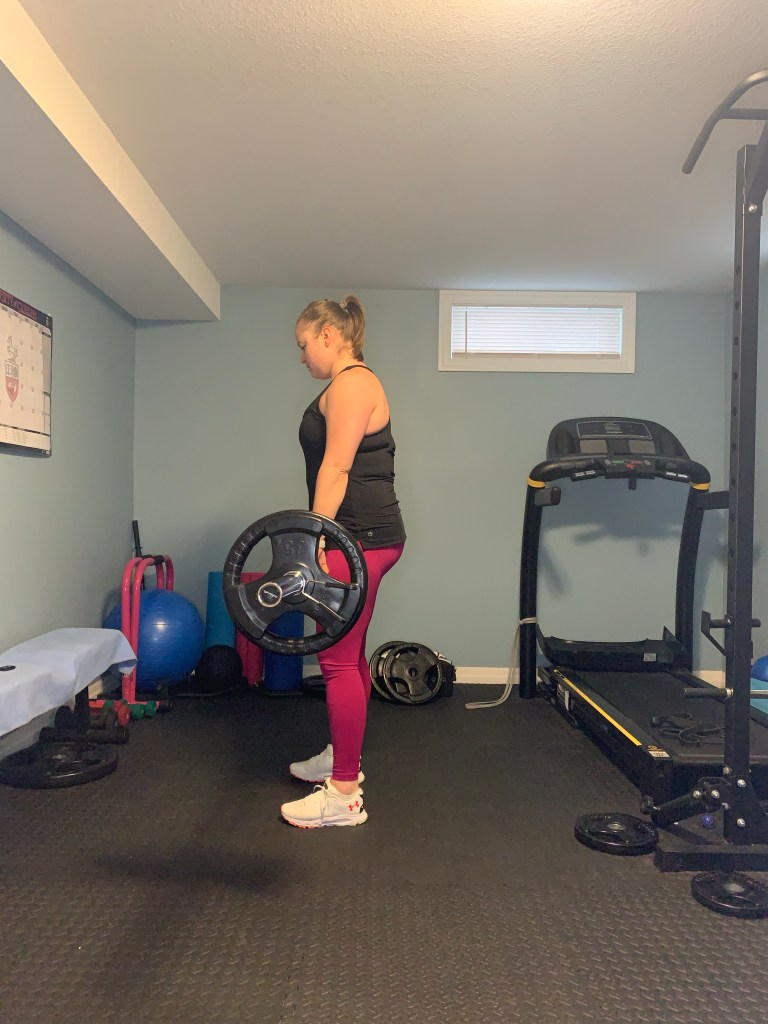 Begin by setting up the barbell on the floor ensuring that you are using bumper plates if you have access (if you don’t have access you can try elevating the bar slightly with small boxes or from safety arms to give yourself a little more height). Ideally you want the bar positioned at about mid-shin. Position your feet about hip width apart. Your spine should stay neutral throughout the movement. With your hands positioned on the bar outside of your legs draw the shoulder blades down and back and pull the slack out of the bar to activate your lats. Keep the bar close to you as you stand up moving through the knees and hips at the same time. At the top of the movement begin your hip hinge backwards to lower the bar back towards the floor maintaining a neutral spine the whole time. Repeat the movement for desired reps.
