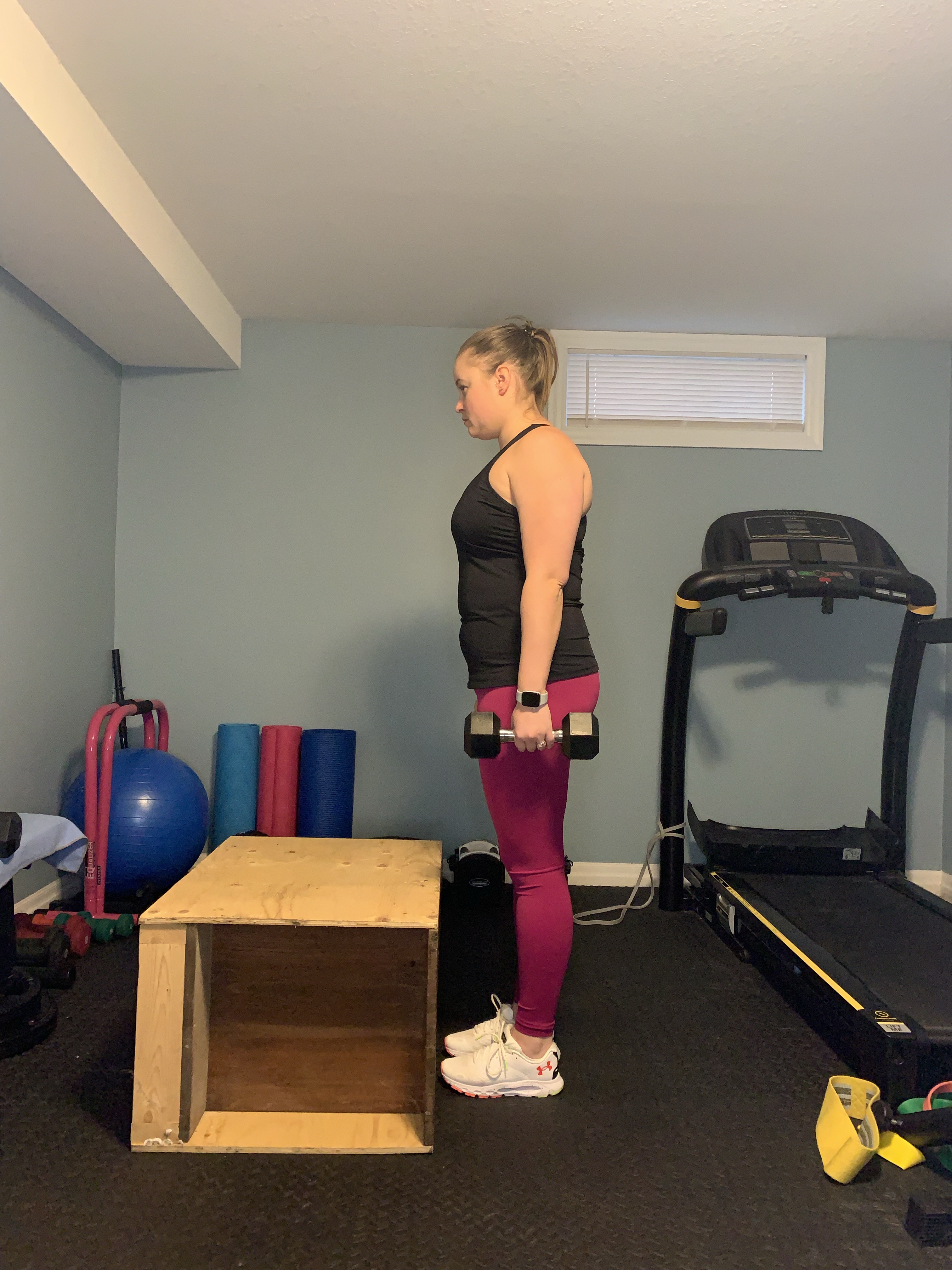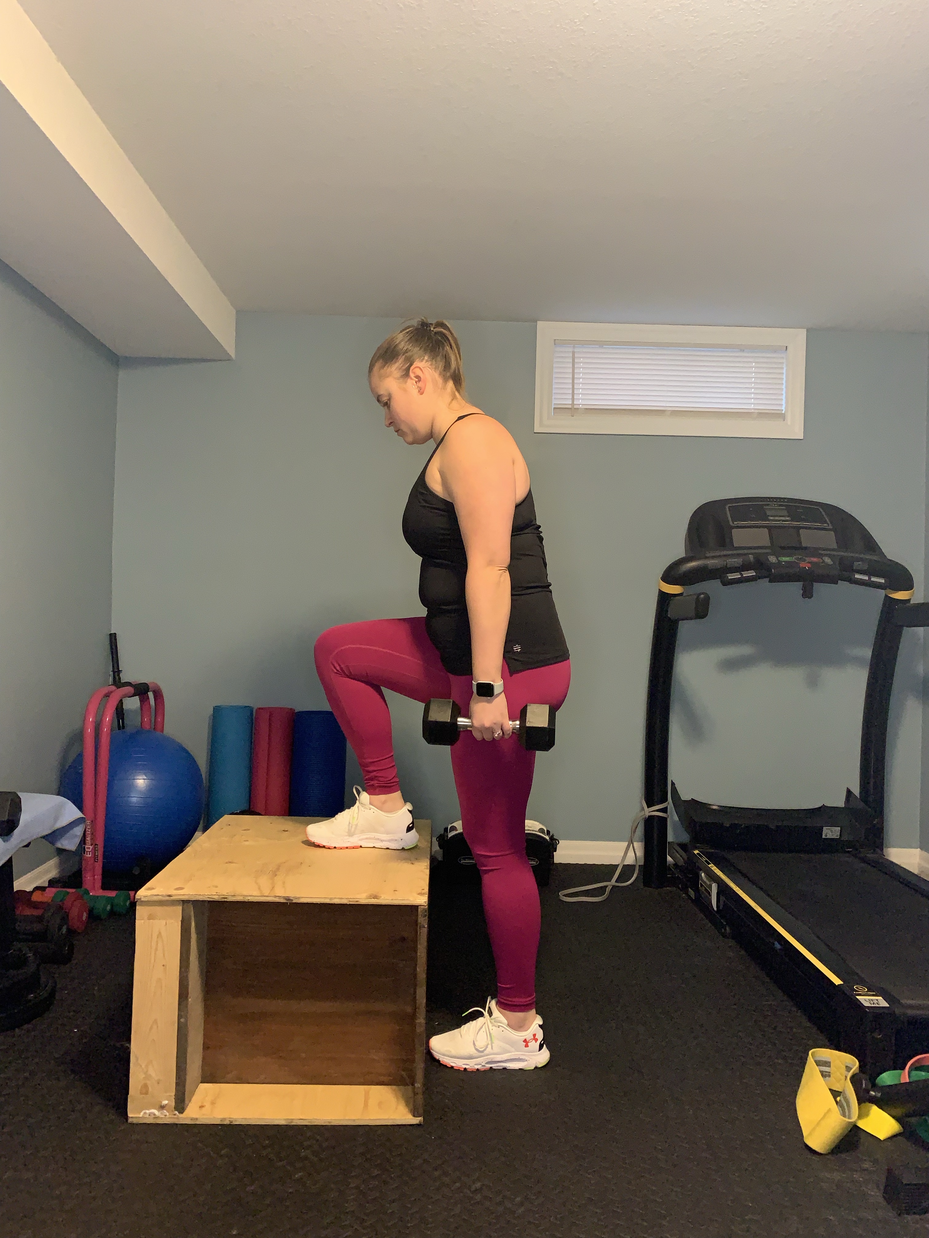 Start standing beside a solid box or bench that you can step up onto with a dumbbell in one hand (opposite hand to the leg you are stepping up with). Place one foot fully on top of the surface then lean your nose over your toes and stand up on the box or bench. At the top of the movement begin to lower yourself back to the floor in a controlled manner (this should be slow and steady, you aren’t falling back to the floor). Return to the floor fully and then repeat, complete all reps and then switch sides.