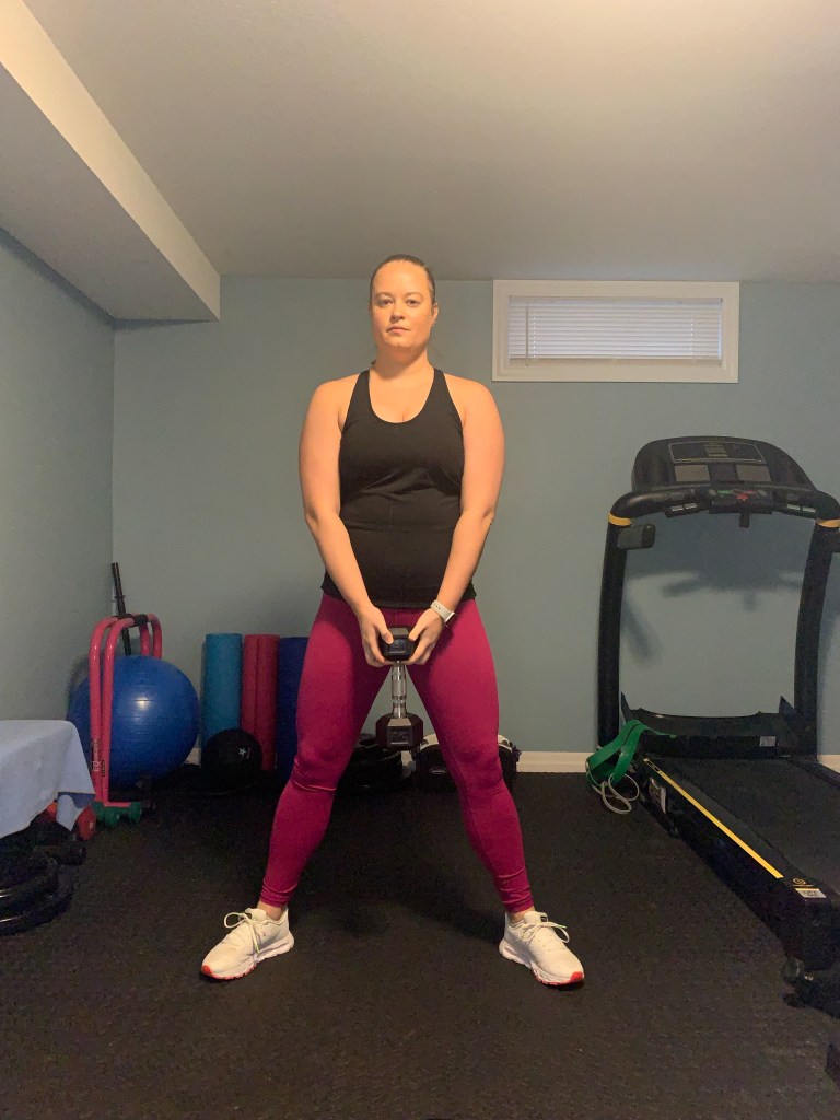 With a wider than shoulder stance and your toes turned out slightly, take a dumbbell or kettlebell in your hands, holding it between your legs. Begin by bending your knees while you reach your hips backwards. Keep your weight evenly distributed throughout your feet and allow your knees to follow the angle of your toes. Ensure that you keep your chest high as you drop down into position. At the bottom of the movement, drive through your feet evenly and squeeze through your inner thighs as you stand back up to your start position.