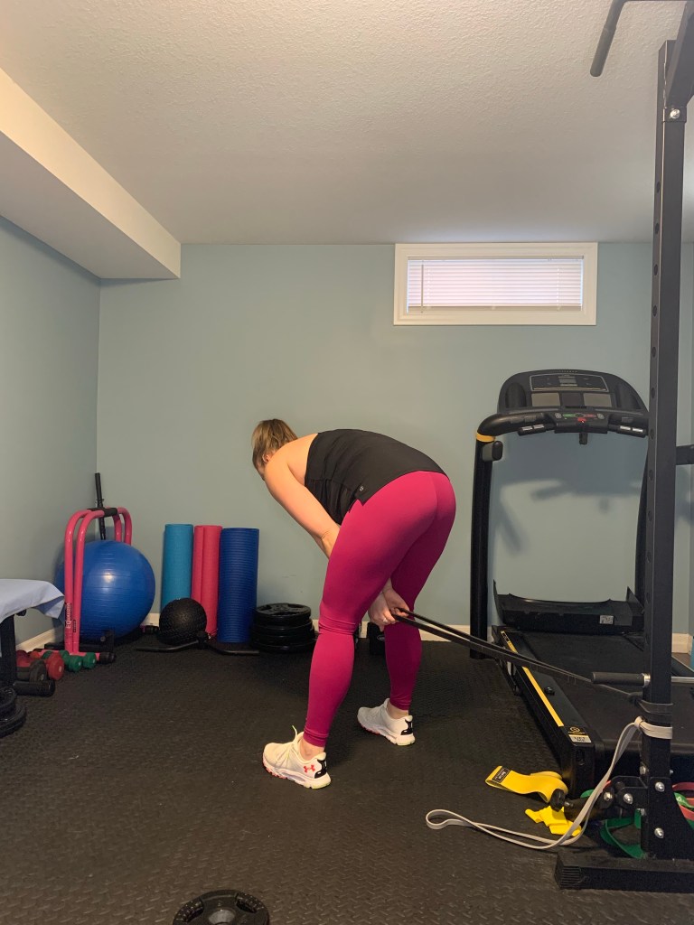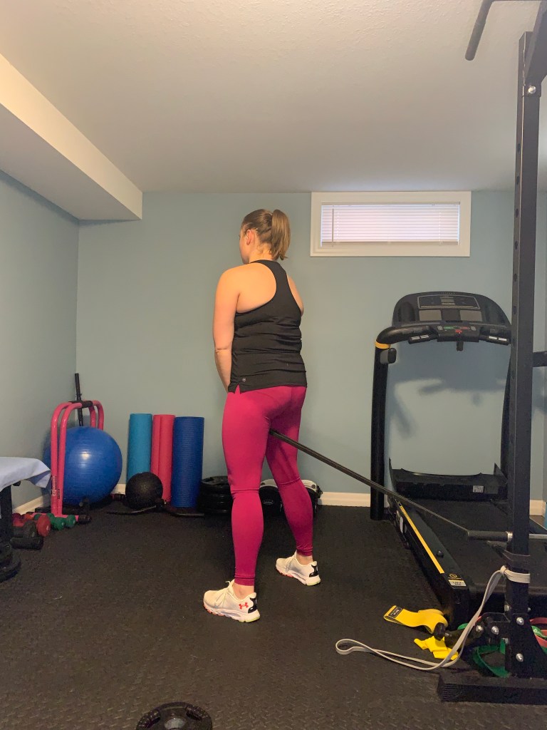 Anchoring the band securely on something that won’t move stand facing away with the band between your legs. Take the band in your hands and stand up tall with a slight bend in your knees. Drive your hips backwards allowing the band to travel between your thighs. Keep your spine neutral as you push your hips backwards and avoid rounding the spine or in the shoulders. At the end range of motion drive the hips forward to stand back up tall and return to the start position.