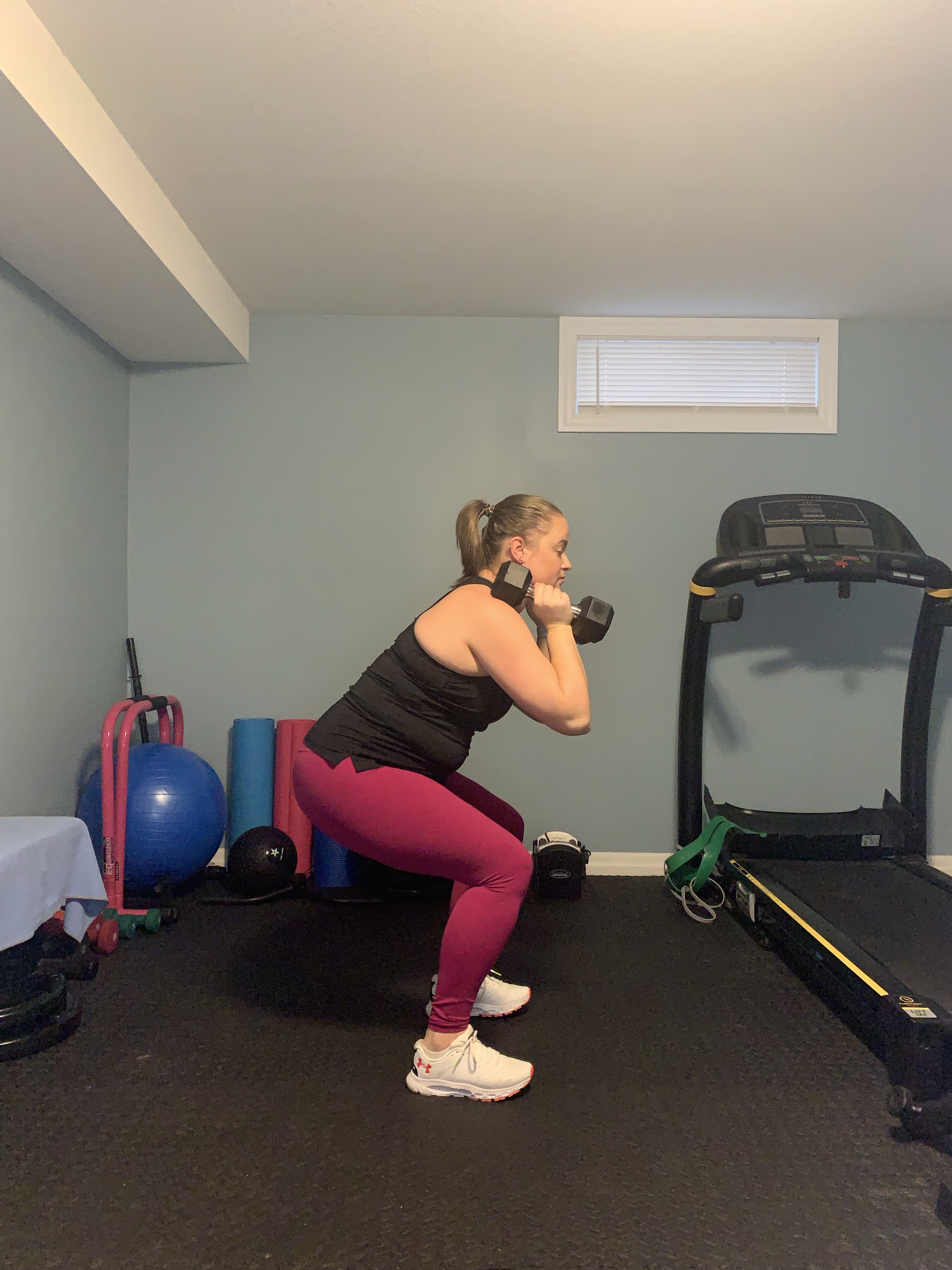 Taking a dumbbell in each hand bring them up to your shoulders while keeping your elbows high. Reach your hips backwards like you are reaching your butt back towards an imaginary chair behind you. Keep your weight evenly distributed throughout your feet. Aim to get your thighs parallel with the floor or a 90 degree bend at the knee (not everyone will be able to get this initially and that’s okay, if you don’t have it yet just ensure you are focusing on range of motion when you practice your squatting movements). Ensure that you keep your chest high as you drop down into position. At the bottom of the movement, drive through your feet evenly and stand back up to your start position.